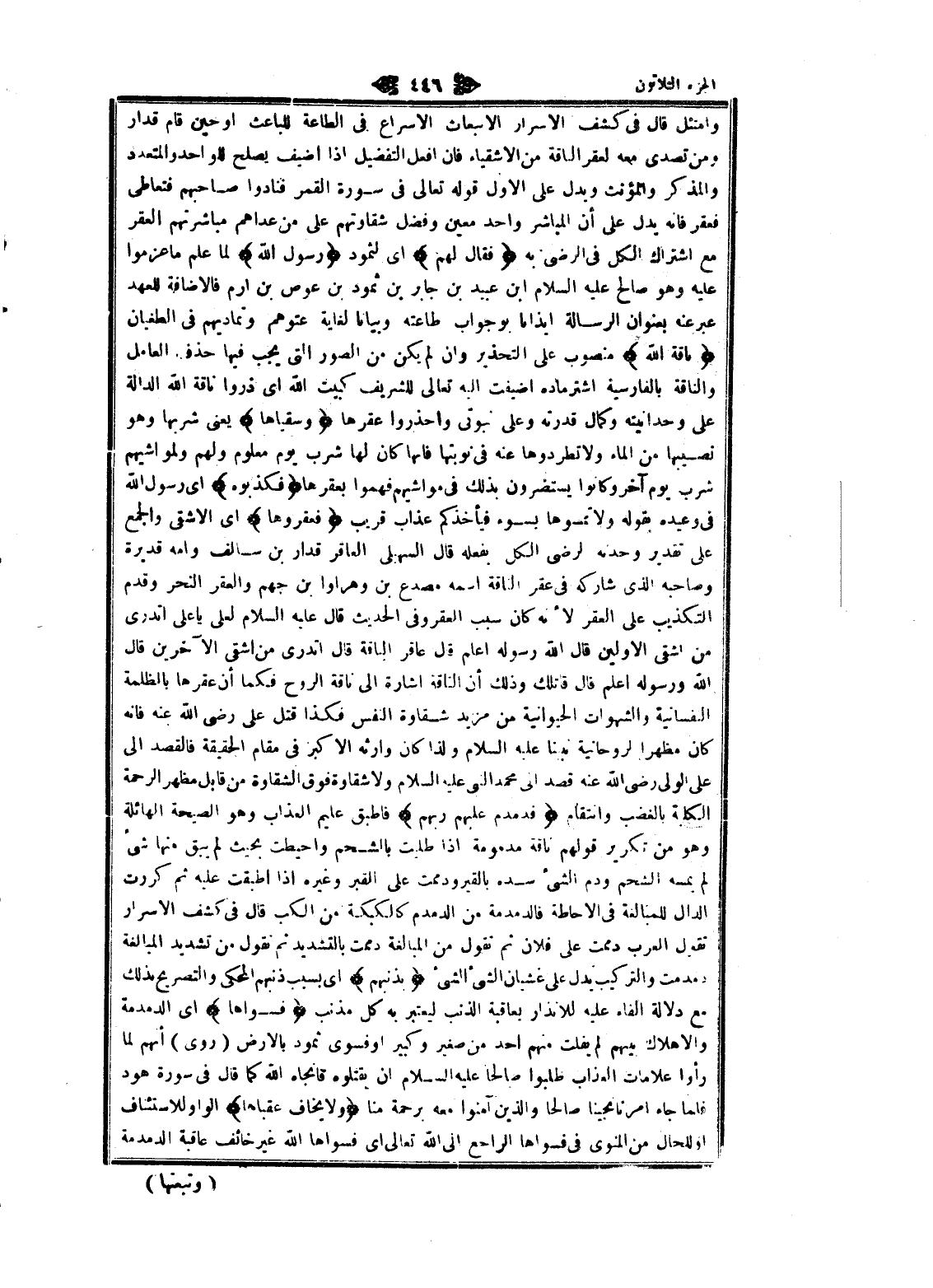 وامتثل قال فى كشف الاسرار الانبعاث الاسراع فى الطاعة للباعث او حين قام قدار ومن تصدى معه لعقر الناقة من الأشقياء فان افعل التفضيل إذا أضيف يصلح للواحد والمتعدد والمذكر والمؤنث ويدل على الاول قوله تعالى فى سورة القمر فنادوا صاحبهم فتعاطى فعقر فانه يدل على أن المباشر واحد معين وفضل شقاوتهم على من عداهم مباشرتهم العقر مع اشتراك الكل فى الرضى به فَقالَ لَهُمْ اى لثمود رَسُولُ اللَّهِ لما علم ما عزموا عليه وهو صالح عليه السلام ابن عبيد بن جابر بن ثمود بن عوص بن ارم فالاضافة للعهد عبر عنه بعنوان الرسالة إيذانا بوجوب اطاعته وبيانا لغاية عتوهم وتماديهم فى الطغيان ناقَةَ اللَّهِ منصوب على التحذير وان لم يكن من الصور التي يجب فيها حذف العامل والناقة بالفارسية اشتر ماده أضيفت اليه تعالى للشريف كبيت الله اى ذروا ناقة الله الدالة على وحدانيته وكمال قدرته وعلى نبوتى واحذروا عقرها وَسُقْياها يعنى شربها وهو نصيبها من الماء ولا تطردوها عنه فى نوبتها فانها كان لها شرب يوم معلوم ولهم ولمواشيهم شرب يوم آخر وكانوا يستضرون بذلك فى مواشيهم فهموا بعقرها فَكَذَّبُوهُ اى رسول الله فى وعيده بقوله ولا تمسوها بسوء فيأخذكم عذاب قريب فَعَقَرُوها اى الأشقى والجمع على تقدير وحدته لرضى الكل بفعله قال السهيلي العاقر قدار بن سالف وامه قديرة وصاحبه الذي شاركه فى عقر الناقة اسمه مصدع بن وهراوا بن جهم والعقر النحر وقدم التكذيب على العقر لأنه كان سبب العقر وفى الحديث قال عليه السلام لعلى يا على أتدري من أشقى الأولين قال الله رسوله اعلم قال عاقر الناقة قال أتدري من أشقى الآخرين قال الله ورسوله اعلم قال قاتلك وذلك أن الناقة اشارة الى ناقة الروح فكما أن عقرها بالظلمة النفسانية والشهوات الحيوانية من مزيد شقاوة النفس فكذا قتل على رضى الله عنه فانه كان مظهرا لروحانية نبينا عليه السلام ولذا كان وارثه الأكبر فى مقام الحقيقة فالقصد الى على الولي رضى الله عنه قصد الى محمد النبي عليه السلام ولا شقاوة فوق الشقاوة من قابل مظهر الرحمة الكلية بالغضب وانتقام فَدَمْدَمَ عَلَيْهِمْ رَبُّهُمْ فاطبق عليم العذاب وهو الصيحة الهائلة وهو من تكرير قولهم ناقة مدمومة إذا طلبت بالشحم وأحيطت بحيث لم يبق منها شىء لم يمسه الشحم ودم الشيء سده بالقير ودممت على القبر وغيره إذا أطبقت عليه ثم كررت الدال للمبالغة فى الإحاطة فالدمدمة من الدمدم كالكبكة من الكب قال فى كشف الاسرار تقول العرب دممت على فلان ثم تقول من المبالغة دممت بالتشديد ثم نقول من تشديد المبالغة دمدمت والتركيب يدل على غشيان الشيء الشيء بِذَنْبِهِمْ اى بسبب ذنبهم المحكي والتصريح بذلك مع دلالة الفاء عليه للانذار بعاقبة الذنب ليعتبر به كل مذنب فَسَوَّاها اى الدمدمة والإهلاك بينهم لم يفلت منهم أحد من صغير وكبير او فسوى ثمود بالأرض (روى) أنهم لما رأوا علامات العذاب طلبوا صالحا عليه السلام ان يقتلوه فانجاه الله كما قال فى سورة هود فلما جاء أمرنا نجينا صالحا والذين آمنوا معه برحمة منا وَلا يَخافُ عُقْباها الواو للاستئناف او للحال من المنوي فى فسواها الراجع الى الله تعالى اى فسواها الله غير خائف عاقبة الدمدمة