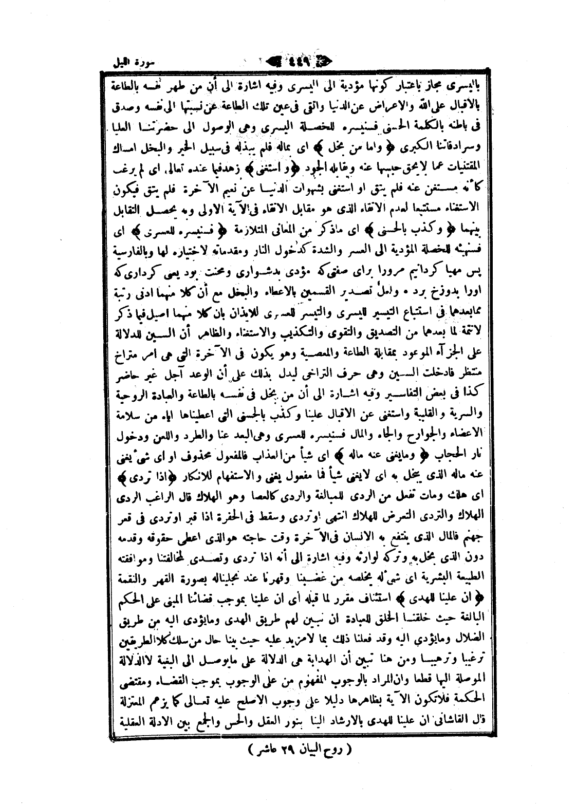 باليسرى مجاز باعتبار كونها مؤدية الى اليسرى وفيه اشارة الى أن من طهر نفسه بالطاعة بالإقبال على الله والاعراض عن الدنيا واتقى فى عين تلك الطاعة عن نسبتها الى نفسه وصدق فى باطنه بالكلمة الحسنى فسنيسره للخصلة اليسرى وهى الوصول الى حضرتنا العليا وسرادقاتنا الكبرى وَأَمَّا مَنْ بَخِلَ اى بماله فلم يبذله فى سبيل الخير والبخل إمساك المقتنيات عما لا يحق حبسها عنه ويقابله الجود وَاسْتَغْنى زهد فيما عنده تعالى اى لم يرغب كأنه مستغن عنه فلم يتق او استغنى بشهوات الدنيا عن نعيم الآخرة فلم يتق فيكون الاستغناء مستتبعا لعدم الاتقاء الذي هو مقابل الاتقاء فى الآية الاولى وبه يحصل التقابل بينهما وَكَذَّبَ بِالْحُسْنى اى ما ذكر من المعاني المتلازمة فَسَنُيَسِّرُهُ لِلْعُسْرى اى فسنهيئه للخصلة المؤدية الى العسر والشدة كدخول النار ومقدماته لاختياره لها وبالفارسية پس مهيا كردانيم مرورا براى صفتى كه مؤدى بدشوارى ومحنت بود يعنى كردارى كه او را بدوزخ برد. ولعل تصدير القسمين بالإعطاء والبخل مع أن كلا منهما ادنى رتبة مما بعدهما فى استتباع التيسير لليسرى والتيسر للعسرى للايذان بان كلا منهما اصيل فيما ذكر لانتمة لما بعدهما من التصديق والتقوى والتكذيب والاستغناء والظاهر أن السين للدلالة على الجزاء الموعود بمقابلة الطاعة والمعصية وهو يكون فى الآخرة التي هى امر متراخ منتظر فادخلت السين وهى حرف التراخي ليدل بذلك على أن الوعد آجل غير حاضر كذا فى بعض التفاسير وفيه اشارة الى أن من بخل فى نفسه بالطاعة والعبادة الروحية والسرية والقلبية واستغنى عن الإقبال علينا وكذب بالحسنى التي أعطيناها إياه من سلامة الأعضاء والجوارح والجاه والمال فسنيسره للعسرى وهى البعد عنا والطرد واللعن ودخول نار الحجاب وَما يُغْنِي عَنْهُ مالُهُ اى شيأ من العذاب فالمفعول محذوف او اى شىء يغنى عنه ماله الذي يبخل به اى لا يغنى شيأ فما مفعول يغنى والاستفهام للانكار إِذا تَرَدَّى اى هلك ومات تفعل من الردى للمبالغة والردى كالعصا وهو الهلاك قال الراغب الردى الهلاك والتردي التعرض للهلاك انتهى او تردى وسقط فى الحفرة إذا قبر او تردى فى قعر جهنم فالمال الذي ينتفع به الإنسان فى الآخرة وقت حاجته هو الذي اعطى حقوقه وقدمه دون الذي بخل به وتركه لوارثه وفيه اشارة الى أنه إذا تردى وتصدى لمخالفتنا وموافقته الطبيعة البشرية اى شىء له يخلصه من غضبنا وقهرنا عند نجلينا له بصورة القهر والنقمة إِنَّ عَلَيْنا لَلْهُدى استئناف مقرر لما قبله اى ان علينا بموجب قضائنا المبنى على الحكم البالغة حيث خلقنا الخلق للعبادة ان نبين لهم طريق الهدى وما يؤدى اليه من طريق الضلال وما يؤدى اليه وقد فعلنا ذلك بما لا مزيد عليه حيث بينا حال من سلك كلا الطريقين ترغيبا وترهيبا ومن هنا تبين أن الهداية هى الدلالة على ما يوصل الى البغية لا الدلالة الموصلة إليها قطعا وان المراد بالوجوب المفهوم من على الوجوب بموجب القضاء ومقتضى الحكمة فلا تكون الآية بظاهرها دليلا على وجوب الأصلح عليه تعالى كما يزعم المعتزلة قال القاشاني ان علينا للهدى بالإرشاد إلينا بنور العقل والحس والجمع بين الادلة العقلية