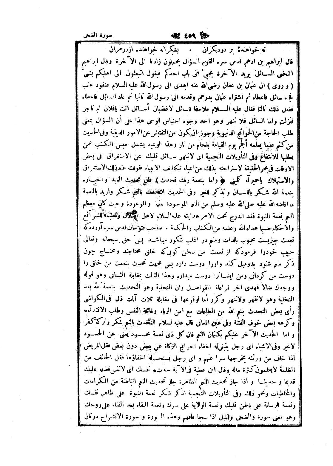 قال ابراهيم بن أدهم قدس سره القوم السؤال يحملون زادنا الى الآخرة وقال ابراهيم النخعي السائل يريد الآخرة يجيئ الى باب أحدكم فيقول أتبعثون الى أهليكم بشئ (وروى) ان عثمان بن عفان رضى الله عنه اهدى الى رسول الله عليه السلام عنقود عنب فجاء سائل فاعطاه ثم اشتراه عثمان بدرهم وقدمه الى رسول الله ثانيا ثم عاد السائل فاعطاه ففعل ذلك ثالثا فقال عليه السلام ملاطفا للسائل لا غضبان أسائل أنت يا فلان أم تاجر فنزلت واما السائل فلا تنهر وهو أحد وجوه احتباس الوحى هذا على أن السؤال بمعنى طلب الحاجة من الحوائج الدنيوية وجوز ان يكون من التفتيش عن الأمور الدينية وفى الحديث من كتم علما يعلمه ألجم يوم القيامة بلجام من نار وهذا الوعيد يشمل حبس الكتب عمن يطلبها للانتفاع وفى التأويلات النجمية اى لا تنهر سائل قلبك عن الاستغراق فى بعض الأوقات فى بحر الحقيقة لاستراحته بذلك من أعباء تكاليف الأنبياء بقولك عند ذلك الاستغراق والاستهلاك يا حميراء كلمينى وَأَمَّا بِنِعْمَةِ رَبِّكَ فَحَدِّثْ فان تحديث العبد واخباره بنعمة الله شكر باللسان وتذكير للغير وفى الحديث التحدث بالنعم شكر وأريد بالنعمة ما افاضة الله عليه صلى الله عليه وسلم من النعم الموجودة منها والموعودة وحيث كان معظم النعم نعمة النبوة فقد اندرج تحت الأمر هدايته عليه السلام لاهل الضلال وتعليمه للشرآئع والاحكام حسبما هداه الله وعلمه من الكتاب والحكمة. صاحب فتوحات قدس سره آورده كه نعمت چيزيست محبوب بالذات ومنعم در اغلب شكور ميباشد پس حق سبحانه وتعالى حبيب خود را فرمود كه از نعمت من سخن كويى كه خلق محتاجند ومحتاج چون ذكر منعم شنود بدو ميل كند واو را دوست دارد پس بجهت تحدث بنعمت من خلق را دوست من كردانى ومن ايشانرا دوست ميدارم وهذا الثالث بمقابلة الثاني وهو قوله ووجدك ضالا فهدى اخر لمراعاة الفواصل وان التحلية وهو التحديث بنعمة الله بعد التخلية وهو لا تقهر ولا تنهر وكرر أما لوقوعها فى مقابلة ثلاث آيات قال فى الكواشي رأى بعض التحدث بنعم الله من الطاعات مع أمن الرياء وغائلة النفس وطلب الاقتداء به وكرهه بعض خوف الفتنة وفى عين المعاني قال عليه السلام التحدث بالنعم شكر وتركه كفر واما الحديث الآخر عليكم بكتمان النعم فان كل ذى نعمة محسود يعنى عن الحسود لا غير وفى الأشباه اى رجل ينبغى له أخفاه إخراج الزكاة عن بعض دون بعض فقل المريض إذا خاف من ورثته يخرجها سرا عنهم واى رجل يستحب له اخفاؤها فقل الخائف من الظلمة لا يعلمون كثرة ماله وقال ابن عطية فى الآية حدث به نفسك اى لا تنس فضله عليك قديما وحديثا وإذا جاز تحديث النعم الظاهرة جاز تحديث النعم الباطنة من الكرامات والمخاطبات ونحو ذلك وفى التأويلات النجمية اذكر شكر نعمة النبوة على ظاهر نفسك ونعمة الرسالة على باطن قلبك ونعمة الولاية على سرك ونعمة البقاء بعد الفناء على روحك وهو معنى سورة والضحى والليل إذا سجا فافهم وهذه السورة وسورة الانشراح درتان