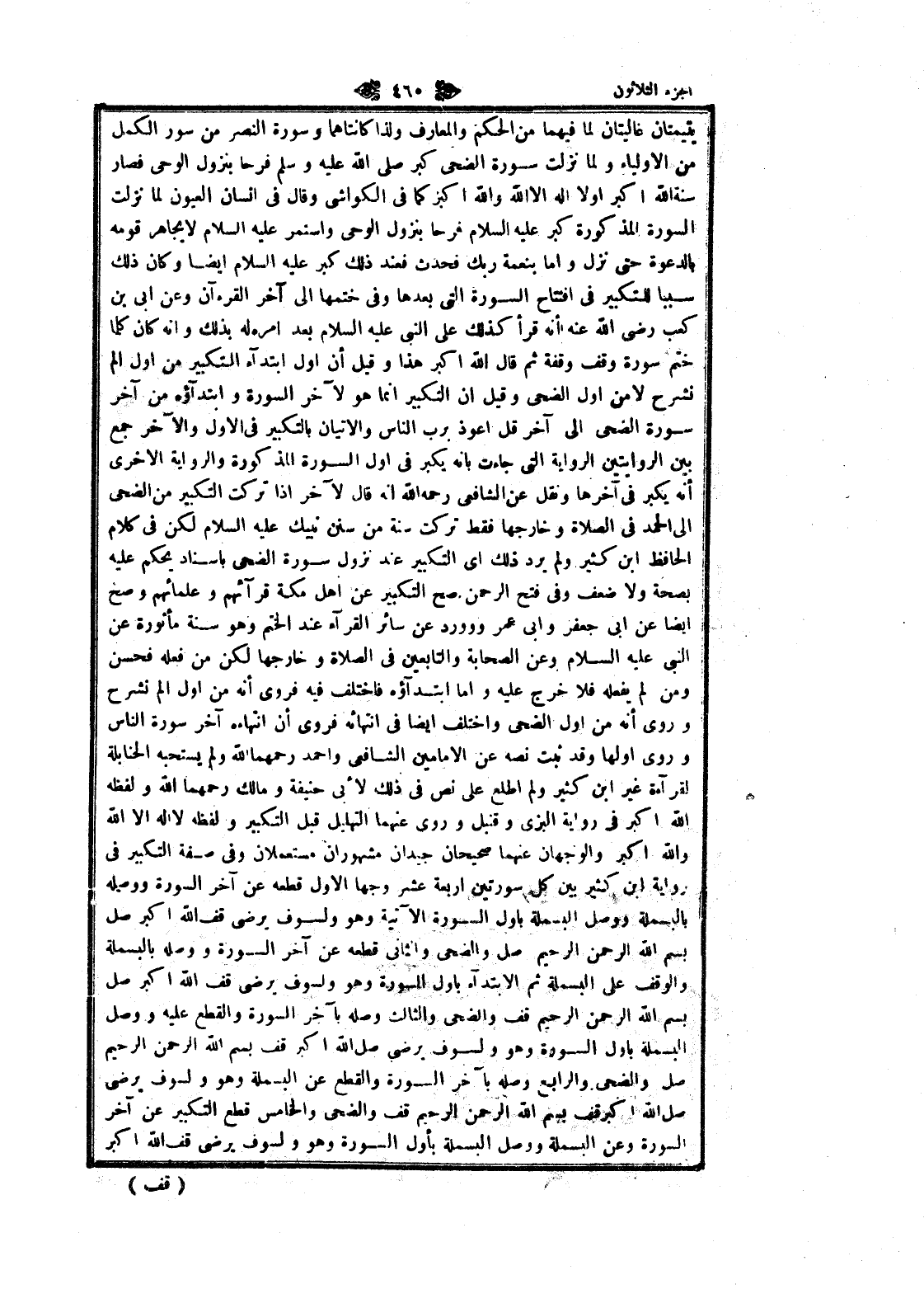 بانه يكبر فى أول السورة المذكورة والرواية الاخرى أنه يكبر فى آخرها ونقل عن الشافعي رحمه الله انه قال لآخر إذا تركت التكبير من الضحى الى الحمد فى الصلاة وخارجها فقط تركت سنة من سنن نبيك عليه السلام لكن فى كلام الحافظ ابن كثير ولم يرد ذلك اى التكبير عند نزول سورة الضحى بإسناد يحكم عليه بصحة ولا ضعف وفى فتح الرحمن صح التكبير عن اهل مكة قرائهم وعلمائهم وصح ايضا عن ابى جعفر وابى عمرو وورد عن سائر القراء عند الختم وهو سنة مأثورة عن النبي عليه السلام وعن الصحابة والتابعين فى الصلاة وخارجها لكن من فعله فحسن ومن لم يفعله فلا خرج عليه واما ابتداؤه فاختلف فيه فروى أنه من أول الم نشرح وروى أنه من أول الضحى واختلف ايضا فى انتهائه فروى أن انتهاءه آخر سورة الناس وروى أولها وقد ثبت نصه عن الإمامين الشافعي واحمد رحمهما الله ولم يستحبه الحنابلة لقرآءة غير ابن كثير ولم اطلع على نص فى ذلك لأبى حنيفة ومالك رحمهما الله ولفظه الله اكبر فى رواية البزي وقنبل وروى عنهما التهليل قبل التكبير ولفظه لا اله الا الله والله اكبر والوجهان عنهما صحيحان جيدان مشهوران مستعملان وفى صفة التكبير فى رواية ابن كثير بين كل سورتين اربعة عشر وجها الاول قطعه عن آخر السورة ووصله بالبسملة ووصل البسملة باول السورة الآتية وهو ولسوف يرضى قف الله اكبر صل بسم الله الرحمن الرحيم صل والضحى والثاني قطعه عن آخر السورة ووصله بالبسملة والوقف على البسملة ثم الابتداء باول السورة وهو ولسوف يرضى قف الله اكبر صل بسم الله الرحمن الرحيم قف والضحى والثالث وصله بآخر السورة والقطع عليه ووصل البسملة باول السورة وهو ولسوف يرضى صل الله اكبر قف بسم الله الرحمن الرحيم صل والضحى والرابع وصله بآخر السورة والقطع عن البسملة وهو ولسوف يرضى صل الله اكبر قف بسم الله الرحمن الرحيم قف والضحى والخامس قطع التكبير عن آخر السورة وعن البسملة ووصل البسملة بأول السورة وهو ولسوف يرضى قف الله اكبر