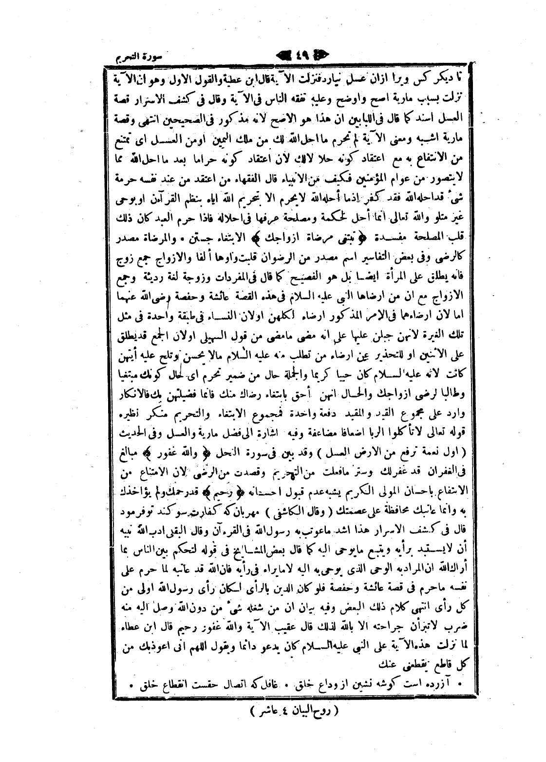 تا ديگر كس ويرا از ان عسل نيارد فنزلت الآية قال ابن عطية والقول الاول وهو ان الآية نزلت بسبب مارية أصح وأوضح وعليه تفقه الناس فى الآية وقال فى كشف الاسرار قصة العسل أسند كما قال فى اللبابين ان هذا هو الأصح لانه مذكور فى الصحيحين انتهى وقصة مارية أشبه ومعنى الآية لم تحرم ما أحل الله لك من ملك اليمين او من العسل اى تمتنع من الانتفاع به
