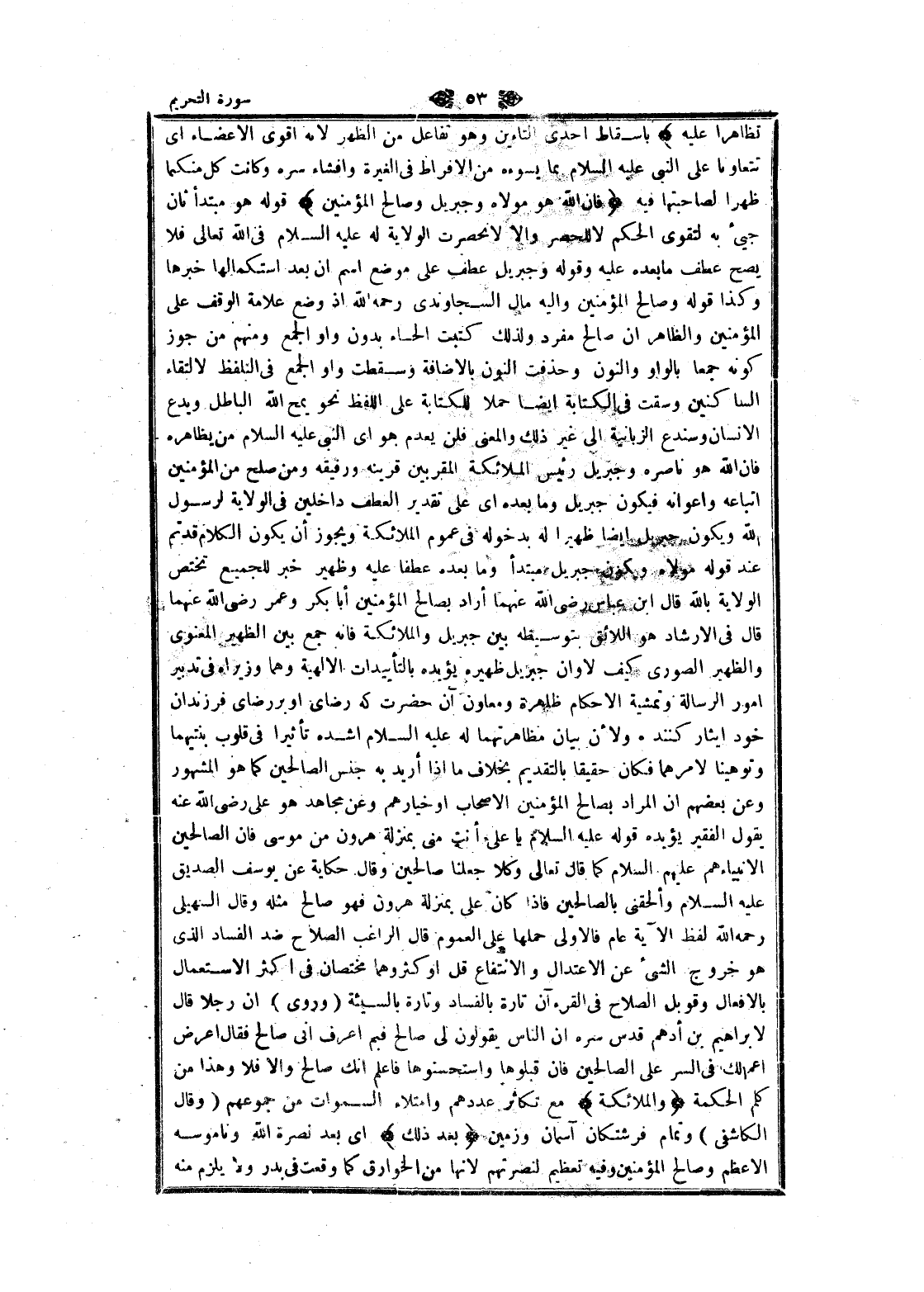 بإسقاط احدى التاءين وهو تفاعل من الظهر لانه أقوى الأعضاء اى تتعاونا على النبي عليه السلام بما يسوءه من الافراط فى الغيرة وافشاء سره وكانت كل منكما ظهرا لصاحبتها فيه فَإِنَّ اللَّهَ هُوَ مَوْلاهُ وَجِبْرِيلُ وَصالِحُ الْمُؤْمِنِينَ قوله هو مبتدأ ثان جيئ به لتقوى الحكم لا للحصر والا لانحصرت الولاية له عليه السلام فى الله تعالى فلا يصح عطف ما بعده عليه وقوله وجبريل عطف على موضع اسم ان بعد استكمالها خبرها وكذا قوله وصالح المؤمنين واليه مال السجاوندى رحمه الله إذ وضع علامة الوقف على المؤمنين والظاهر ان صالح مفرد ولذلك كتبت الحاء بدون واو الجمع ومنهم من جوز كونه جمعا بالواو والنون وحذفت النون بالاضافة وسقطت واو الجمع فى التلفظ لالتقاء الساكنين وسقت فى الكتابة ايضا حملا للكتابة على اللفظ نحو يمح الله الباطل ويدع الإنسان وسندع الزبانية الى غير ذلك والمعنى فلن يعدم هو اى النبي عليه السلام من يظاهره فان الله هو ناصره وجبريل رئيس الملائكة المقربين قرينه ورفيقه ومن صلح من المؤمنين اتباعه وأعوانه فيكون جبريل وما بعده اى على تقدير العطف داخلين فى الولاية لرسول الله ويكون جبريل ايضا ظهيرا له بدخوله فى عموم الملائكة ويجوز
