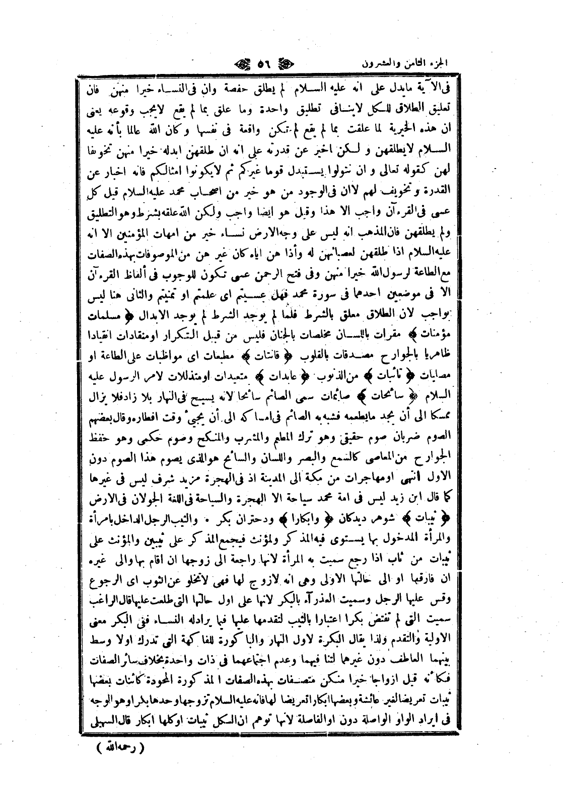فتح الرحمن عسى تكون للوجوب فى ألفاظ القرآن الا فى موضعين أحدهما فى سورة محمد فهل عسيتم اى علمتم او تمنيتم والثاني هنا ليس بواجب لان الطلاق معلق بالشرط فلما لم يوجد الشرط لم يوجد الابدال مُسْلِماتٍ مُؤْمِناتٍ مقرات باللسان مخلصات بالجنان فليس من قبيل التكرار او منقادات انقيادا ظاهريا بالجوارح مصدقات بالقلوب قانِتاتٍ مطبعات اى مواظبات على الطاعة او مصليات تائِباتٍ من الذنوب عابِداتٍ متعيدات او متذللات لامر الرسول عليه السلام سائِحاتٍ صائمات سمى الصائم سائحا لانه يسيح فى النهار بلا زاد فلا يزال ممسكا الى أن يجد ما يطعمه فشبه به الصائم فى إمساكه الى أن يجيئ وقت إفطاره وقال بعضهم الصوم ضربان صوم حقيقى وهو ترك المطعم والمشرب والمنكح وصوم حكمى وهو حفظ الجوارح من المعاصي كالسمع والبصر واللسان والسائح هو الذي يصوم هذا الصوم دون الاول انتهى او مهاجرات من مكة الى المدينة إذ فى الهجرة مزيد شرف ليس فى غيرها كما قال ابن زيد ليس فى امة محمد سياحة الا الهجرة والسياحة فى اللغة الجولان فى الأرض ثَيِّباتٍ شوهر ديدكان وَأَبْكاراً ودختران بكر. والثيب الرجل الداخل بامرأة والمرأة المدخول بها يستوى فيه المذكر والمؤنث فيجمع المذكر على ثيبين والمؤنث على ثيبات من ثاب إذا رجع سميت به المرأة لانها راجعة الى زوجها ان اقام بها والى غيره ان فارقها او الى حالتها الاولى وهى انه لازوج لها فهى لا تخلو عن الثوب اى الرجوع وقس عليها الرجل وسميت العذراء بالبكر لانها على أول حالتها التي طلعت عليها قال الراغب سميت التي لم تفتض بكرا اعتبارا بالثيب لتقدمها عليها فيما يراد له النساء ففى البكر معنى الاولية والتقدم ولذا يقال البكرة لاول النهار والباكورة للفاكهة التي تدرك اولا وسط بينهما العاطف دون غيرهما لتنافيهما وعدم اجتماعهما فى ذات واحدة بخلاف سائر الصفات فكأنه قيل أزواجا خيرا منكن متصفات بهذه الصفات المذكورة المحودة كائنات بعضها ثيبات تعريضا لغير عائشة وبعضها أبكارا تعريضا لها فانه عليه السلام تزوجها وحدها بكرا وهو الوجه فى إيراد الواو الواصلة دون او الفاصلة لانها توهم ان الكل ثيبات او كلها أبكار قال السهيلي