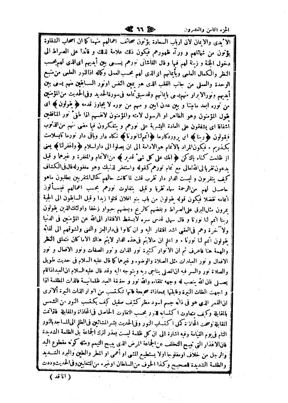 الأيدى والايمان لان ارباب السعادة يؤتون صحائف أعمالهم منهما كما ان اصحاب الشقاوة يؤتون من شمائلهم وورلء ظهورهم فيكون ذلك علامة لذلك وقائدا على الصراط الى دخول الجنة وزينة لهم فيها وقال القاشاني نورهم يسعى بين أيديهم اى الذي لهم بحسب النظر والكمال العلمي وبأيمانهم اى الذي لهم بحسب العمل وكماله إذ النور العلمي من منبع الوحدة والعملي من جانب القلب الذي هو يمين النفس او نور السابقين منهم يسعى بين أيديهم ونور الأبرار منهم يسعى بايمانهم وقد سبق تمامه فى سورة الحديد وفى الحديث من المؤمنين من نوره ابعد ما بيننا وبين عدن أبين ومنهم من نوره لا يجاوز قدمه يَقُولُونَ اى يقول المؤمنون وهو الظاهر او الرسول لامته والمؤمنون لانفسهم إذا طفئ نور المنافقين إشفاقا اى يشفقون على العادة البشرية على نورهم ويتفكرون فيما مضى منهم من الذنوب فيقولون رَبَّنا اى پروردگار ما أَتْمِمْ لَنا نُورَنا نكاه دار وباقى دار نور ما تا بسلامت بگذريم. فيكون المراد بالإتمام هو الادامة الى ان يصلوا الى دار السلام وَاغْفِرْ لَنا يعنى از ظلمت كناه پاك كن إِنَّكَ عَلى كُلِّ شَيْءٍ قَدِيرٌ من الإتمام والمغفرة وغيرهما وقيل يدعون تقربا الى الله تعالى مع تمام نورهم كقوله واستغفر لذنبك وهو مغفور له قال فى الكشاف كيف يتقربون وليست الدار دار تقرب قلت لما كانت حالهم كحال المتقربين يطلبون ما هو حاصل لهم من الرحمة سماه تقربا وقيل يتفاوت نورهم بحسب أعمالهم فيسألون إتمامه تفضلا فيكون قوله يقولون من باب بنو فلان قتلوا زيدا وقيل السابقون الى الجية يمرون مثل البرق على الصراط وبغضهم كالريح وبعضهم حبواو زخفا وأولئك الذين يقولون ربنا أتمم لنا نورنا وقال سهل قدس سره لا يسقط الافتقار الى الله عن المؤمنين فى الدنيا ولآخرة وهم فى العقبى أشد افتقار اليه وان كانوا فى دار العز والغنى ولشوقهم الى لقائه يقولون أتمم لنا نورنا. واعلم ان مالايتم فى هذه الدار لا يتم هناك الا ما كان متعلق النظر والهمة هنا فاعرف ثم ان الأنوار كثيرة نور الذات ونور الصفات ونور الافعال ونور الافعال ونور العبادات مثل الصلاة والوضوء وغيرهما كما قال عليه السلام فى حديث طويل والصلاة نور والسر فيه ان المصلى يناجى ربه ويتوجه اليه وقد قال عليه السلام ان العبد إذا قام يصلى فان الله ينصب له وجهه تلقاءه والله نور وحقيقة العبد ظلمانية فالذات المظلمة إذا واجهت الذات النيرة وقابلتها بمحاذاة صحيحة فانها تكتسب من أنوار الذات النيرة ألا ترى ان القمر الذي هو فى ذاته جسم اسود مظم كثيف صقيل كيف يكتسب النور من الشمس بالمقابلة وكيف يتفاوت اكتسابه للنور بحسب التفاوت الحاصل فى المحاذاة والمقابلة فاذا تمت المقابلة وصحت المحاذاة كمل اكتساب النور وفى الحديث بشر المشائين فى الظلم الى المساجد بالنور التام فى يوم القيامة وفيه اشارة الى ان كل ظلمة ليست بعذر لترك الجماعة بل الظلمة الشديدة فان الأعذار التي تبيح التخلف عن الجماعة المرض الذي يبيح التيمم ومثله كونه مقطوع اليد والرجل من خلاف او مفلوجا اولا يستطيع المشي او أعمى او المطر والطين والبرد الشديد والظلمة الشديدة للصحيح وكذا الخوف من السلطان او غيره من المتغلبين وفى الحديث وددت