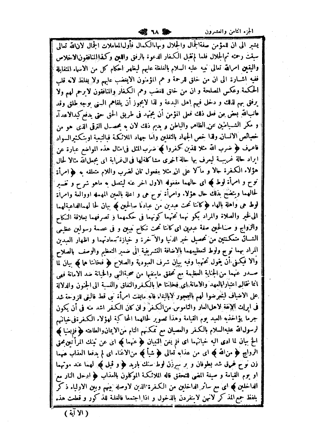 يشير الى ان للمؤمن صفة الجمال والجلال وبهاء الكمال فأول المعاملات الجمال لان الله تعالى سبقت رحمته ثم الجلال فلما لم تقبل الكفار الدعوة بالرفق واللين وكذا المنافقون الإخلاص واليقين امر الله تعالى نبيه عليه السلام بالغلظة عليهم ليظهر احكام كل من الأسماء المتقابلة ففيه اشارة الى ان من خلق للرحمة وهم المؤمنون الا يغضب عليهم ولا يغلظ لانه قلب الحكمة وعكس المصلحة وان من خلق للغضب وهم الكفار والمنافقون لا يرحم لهم ولا يرفق بهم لذلك ودخل فيهم اهل البدعة ولذا لا يجوز أن يلقاهم السنى بوجه طلق وقد عاتب الله بعض من فعل ذلك فعلى المؤمن أن يجتهد فى طريق الحق حتى يدفع كيد الأعداء ومكر الشياطين عن الظاهر والباطن ويديم ذلك لان به يحصل الترقي الذي هو من خصائص الإنسان ولذا خص الجهاد بالثقلين واما جهاد الملائكة فبالتبعية او بتكثير السواد فاعرف ضَرَبَ اللَّهُ مَثَلًا لِلَّذِينَ كَفَرُوا ضرب المثل فى أمثال هذه المواضع عبارة عن إيراد حالة غريبة ليعرف بها حالة اخرى مشاكلة لها فى ال غرابة اى يجعل الله مثالا لحال هؤلاء الكفرة حالا ومآلا على ان مثلا مفعول ثان لضرب واللام متعلقه به امْرَأَتَ نُوحٍ وَامْرَأَتَ لُوطٍ اى حالهما مفعوله الاول اخر عنه ليتصل به ما هو شرح وتفسير لحالهما ويتضح بذلك حال هؤلاء وامرأة نوح هى واعلة بالعين المهملة او والعة وامرأة لوط هى واهلة بالهاء كانَتا تَحْتَ عَبْدَيْنِ مِنْ عِبادِنا صالِحَيْنِ بيان لحالهما الداعية لهما الى الخير والصلاة والمراد بكونهما تحتهما كونهما فى حكمهما وتصرفهما بعلاقة النكاح والزواج وصالحين صفة عبدين اى كانتا تحت نكاح نبيين وفى عصمة رسولين عظيمى الشان متمكنتين من تحصيل خير الدنيا والآخرة وخيازة سعادتهما واظهار العبدين المراد بهما نوح ولوط لتعظيمهما بالاضافة التشريفية الى ضمير التعظيم والوصف بالصلاح والا فيكفى أن يقول تحتهما وفيه بيان شرف العبودية والصلاح فَخانَتاهُما بيان لما صدر عنهما من الجناية العظيمة مع تحقق ما ينفيها من صحبة النبي والخيانة ضد الامانة فهى انما تقال اعتبارا بالعهد والامانة اى فخانتا هما بالكفر والنفاق والنسبة الى الجنون والدلالة على الأضياف ليتعرضوا لهم بالفجور لا بالبغاء فانه ما بغت امرأة نبى قط فالبغى للزوجة شد فى ايراث الانفة لاهل العار والناموس من الكفر وان كان الكفر أشد منه فى أن يكون جرما يؤاخذ به العبد يوم القيامة وهذا تصوير لحالهما المحاكية لهؤلاء الكفرة فى خيانتهم لرسول الله عليه السلام بالكفر والعصيان مع تمكنهم التام من الايمان والطاعة فَلَمْ يُغْنِيا إلخ بيان لما ادى اليه خيانتهما اى فلم يغن البيان عَنْهُما اى عن تينك المرأتين بحق الرواج مِنَ اللَّهِ اى من عذابه تعالى شَيْئاً من الإغناء اى لم يدفعا العذاب عنهما زن نوح غرق شد بطوفان وبر سر زن لوط سنك باريد وَقِيلَ لهما عند موتهما او يوم القيامة وصيغة المضي للتحقق قاله الملائكة الموكلون بالعذاب ادْخُلَا النَّارَ مَعَ الدَّاخِلِينَ اى مع سائر الداخلين من الكفرة الذين لا وصلة بينهم. وبين الأولياء ذكر بلفظ جمع المذكر لانهن لا ينفردن بالدخول وإذا اجتمعا فالغلبة للذكور وقطعت هذه