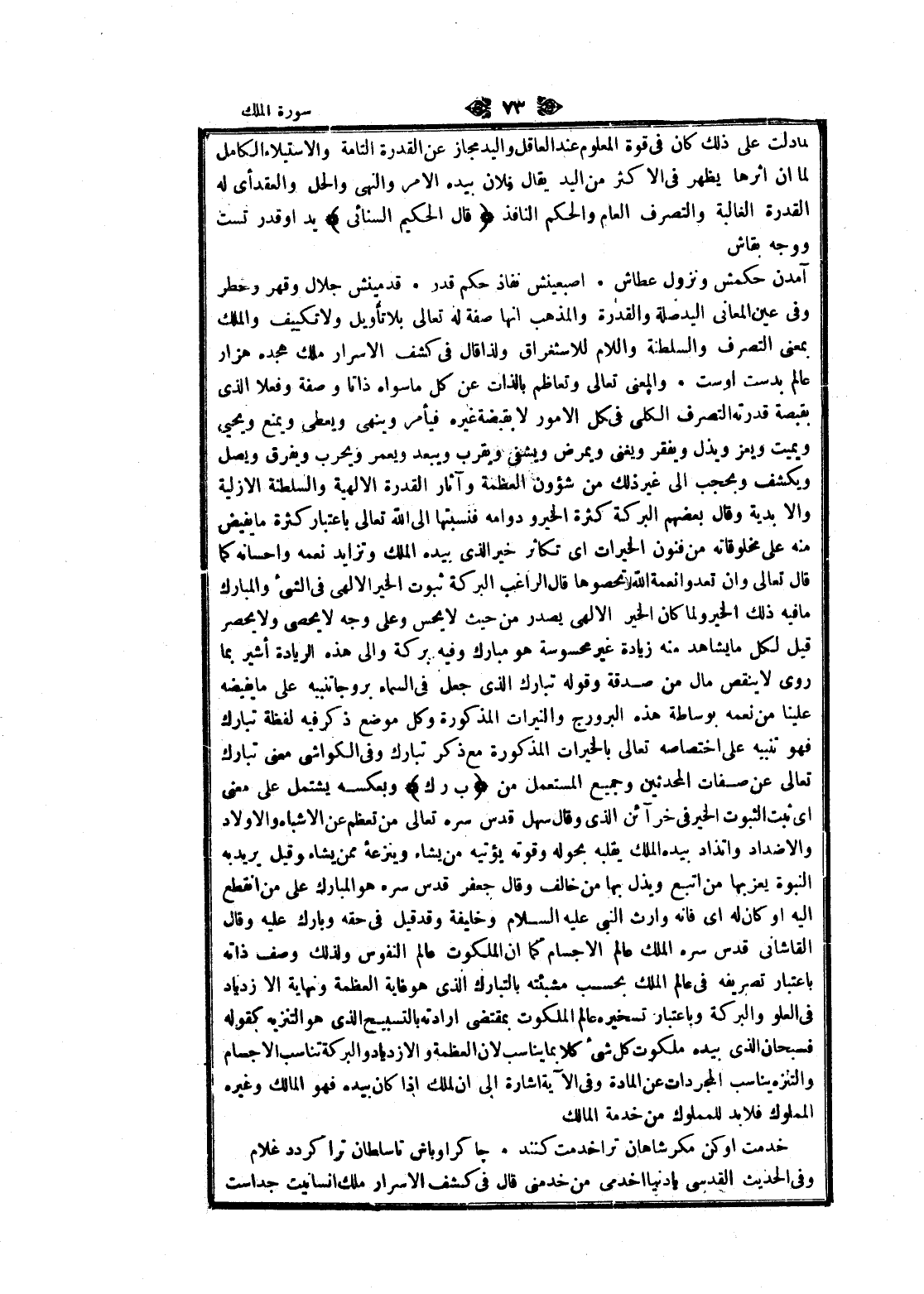 وفى عين المعاني اليد صلة والقدرة والمذهب انها صفة له تعالى بلا تأويل ولا تكييف والملك بمعنى التصرف والسلطنة واللام للاستغراق ولذا قال فى كشف الاسرار ملك هجده هزار عالم بدست اوست. والمعنى تعالى وتعاظم بالذات عن كل ما سواه ذاتا وصفة وفعلا الذي بقبضة قدرته التصرف الكلى فى كل الأمور لا بقبضة غيره فيأمر وينهى ويعطى ويمنع ويحيى ويميت ويعز ويذل ويفقر ويغنى ويمرض ويشفى ويقرب ويبعد ويعمر ويحرب ويفرق ويصل ويكشف وبحجب الى غير ذلك من شؤون العظمة وآثار القدرة الالهية والسلطنة الازلية والابدية وقال بعضهم البركة كثرة الخير ودوامه فنسبتها الى الله تعالى باعتبار كثرة ما يفيض منه على مخلوقاته من فنون الخيرات اى تكاثر خير الذي بيده الملك وتزايد نعمه وإحسانه كما قال تعالى وان تعدوا نعمة الله تحصوها قال الراغب البركة ثبوت الخير الإلهي فى الشيء والمبارك ما فيه ذلك الخير ولما كان الخير الإلهي يصدر من حيث لا يحس وعلى وجه لا يحصى ولا يحصر قيل لكل ما يشاهد منه زيادة غير محسوسة هو مبارك وفيه بركة والى هذه الزيادة أشير بما روى لا ينقص مال من صدقة وقوله تبارك الذي جعل فى السماء بروجا تنبيه على ما يفيضه علينا من نعمه بوساطة هذه البرورج والنيرات المذكورة وكل موضع ذكر فيه لفظة تبارك فهو تنبيه على اختصاصه تعالى بالخيرات المذكورة مع ذكر تبارك وفى الكواشي معنى تبارك تعالى عن صفات المحدثين وجميع المستعمل من ب ر ك وبعكسه يشتمل على معنى اى ثبت الثبوت الخير فى خزآئن الذي وقال سهل قدس سره تعالى من تعظم عن الأشباه والأولاد والاضداد واتذاد بيده الملك يقلبه بحوله وقوته يؤتيه من يشاء وينزعه ممن يشاء وقيل يريد به النبوة يعزبها من اتبع ويذل بها من خالف وقال جعفر قدس سره هو المبارك على من انقطع اليه او كان له اى فانه وارث النبي عليه السلام وخليفة وقد قيل فى حقه وبارك عليه وقال القاشاني قدس سره الملك عالم الأجسام كما ان الملكوت عالم النفوس ولذلك وصف ذاته باعتبار تصريفه فى عالم الملك بحسب مشبئته بالتبارك الذي هو غاية العظمة ونهاية الازدياد فى العلو والبركة وباعتبار تسخيره عالم الملكوت بمقتضى إرادته بالتسبيح الذي هو التنزيه كقوله فسبحان الذي بيده ملكوت كل شىء كلا بما يناسب لان العظمة والازدياد والبركة تناسب الأجسام والتنزه يناسب المجردات عن المادة وفى الآية اشارة الى ان لملك إذا كان بيده فهو المالك وغيره المملوك فلا بد للمملوك من خدمة المالك
