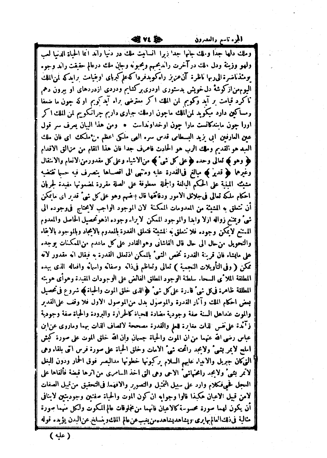وملك دلها جدا وملك جانها جدا زيرا انسانيت ملك در دنيا راند انما الحياة الدنيا لعب ولهو وزينة ودل ملك در آخرت راند يحبهم ويحبونه وجان ملك در عالم حقيقت راند وجوه يومئذ ناضرة الى ربها ناظرة آن عزيز راه كويد فردا كه علم كبرياى او بقيامت برايد كه لمن الملك اليوم من از كوشه دل خويش بدستورى او درى بركشايم ودردى از دردهاى او بيرون دهم تا كرد قيامت برآيد وكويم لمن الملك اگر معترضى براه آيد كويم او كه چون ما ضعفا ومساكين دارد ميكويد لمن الملك ما چون او ملك جبارى داريم چرا نكوييم لمن الملك اگر او را چون ما بندگانست ما را چون او خداوند است. ومن هذا البيان يعرف سر قول عين العارفين ابى يزيد البسطامي قدس سره الهى ملكى أعظم من ملكك اى فان ملك العبد هو القديم وملك الرب هو الحادث فاعرف جدا فان هذا المقام من مزالق الاقدام وَهُوَ تعالى وحده عَلى كُلِّ شَيْءٍ من الأشياء وعلى كل مقدور من الانعام والانتقال وغيرهما قَدِيرٌ مبالغ فى القدرة عليه ومنتهى الى أقصاها يتصرف فيه حسبما تقتضيه مشيئته المبنية على الحكم البالغة والجملة معطوفة على الصلة مقررة لمضمونها مفيدة لجريان احكام ملكه تعالى فى جلائل الأمور ودقائقها قال بعضهم وهو على كل شىء قدير اى ما يمكن أن تتعلق به المشيئة من المعدومات الممكنة لان الموجود الواجب لا يحتاج فى وجوده الى شىء ويمتنع زواله ازلا وابدا والموجود الممكن لا يراد وجوده إذ هو تحصيل الحاصل والمعدوم الممتنع لا يمكن وجوده فلا تتعلق به المشيئة فتعلق القدرة بالمعدوم بالإيجاد وبالموجود بالابقاء والتحويل من حال الى حال قال القاشاني وهو القادر على كل ما عدم من الممكنات يوجده على ما يشاء فان قرينة القدرة تخص الشيء بالممكن إذ تعلل القدرة به فيقال انه مقدور لانه ممكن (وفى التأويلات النجمية) تعالى وتعاظم فى ذاته وصفاته وأسمائه وأفعاله الذي بيده المطلقة الملأى السحاء سلطنة الوجود المطلق الفائض على الوجودات المقيدة وهو أي هويته المطلقة ظاهرة فى كل شىء قادرة على كل شىء الَّذِي خَلَقَ الْمَوْتَ وَالْحَياةَ شروع فى تحصيل بعض احكام الملك وآثار القدرة والموصول بدل من الموصول الاول فلا وقف على القدير والموت عند اهل السنة صفة وجودية مضادة للحياة كالحرارة والبرودة والحياة صفة وجودية زائدة على نفس لذات مغايرة للعلم والقدرة مصححة لاتصاف الذات بهما وما روى عن ابن عباس رضى الله عنهما من ان الموت والحياة جسمان وان الله خلق الموت على صورة كبش أملح لا يمر بشئ ولا يجد رائحته شىء إلا مات وخلق الحياة على صورة فرس أنثى بلقاء وهى التي كان جبريل والأنبياء عليهم السلام يركبونها خطوتها مد البصر فوق الحمار ودون البغل لا تمر بشئ ولا يجد رايحتها شىء الا حى وهى التي أخذ السامري من اثرها قبضة فألقاها على العجل فحيى فكلام وارد على سبيل التمثيل والتصوير وإلا فهما فى التحقيق من قبيل الصفات لا من قبيل الأعيان هكذا قالوا وجوابه ان كون الموت والحياة صفتين وجوديتين لا ينافى أن يكون لهما صورة محسوسة كالاعيان فانهما من مخلوقات عالم الملكوت ولكل منهما صورة مثالية فى ذلك العالم بها يرى ويشاهد يشاهده من يغيب عن عالم الملك وينسلخ عن البدن يؤيده قوله