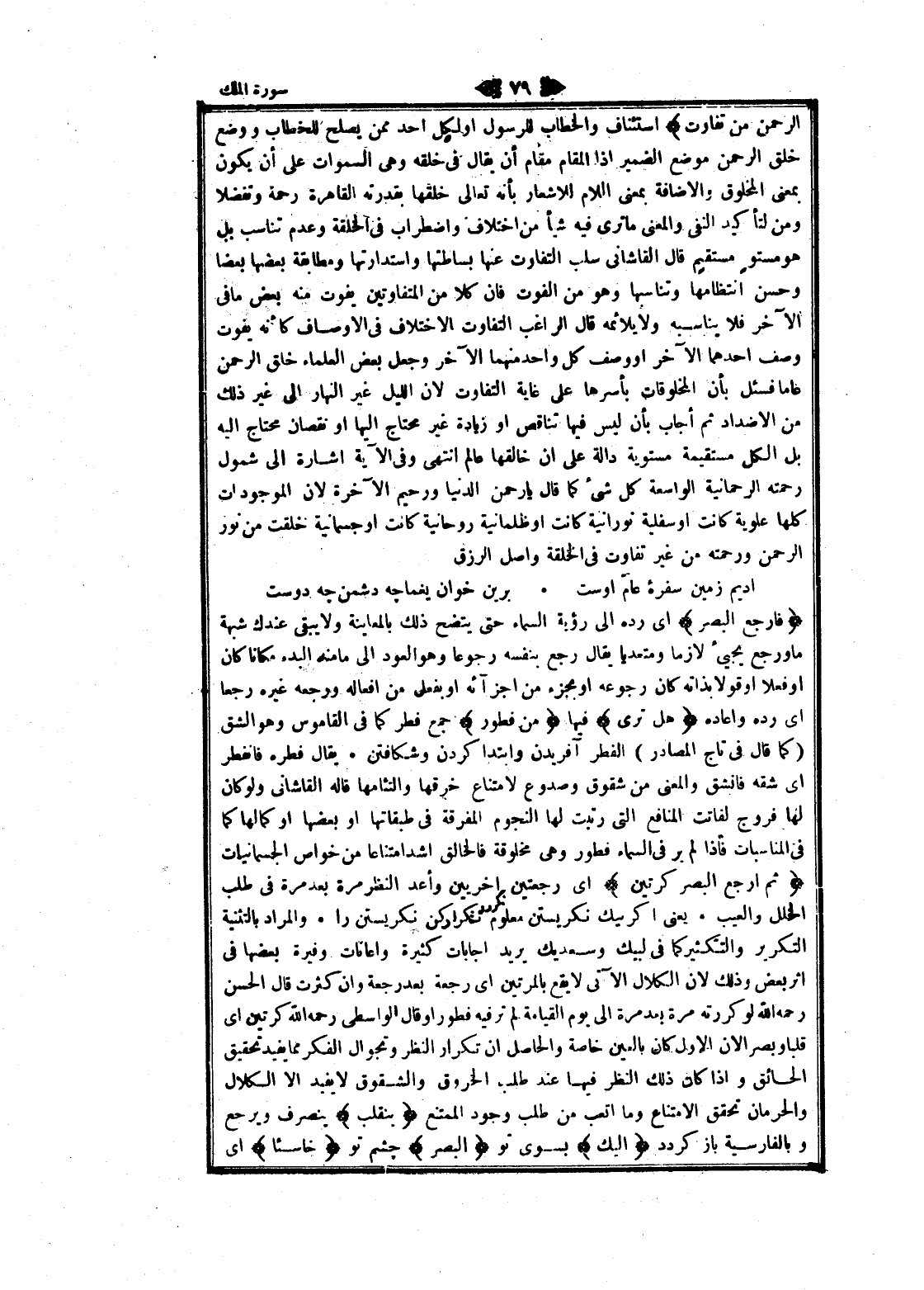 فَارْجِعِ الْبَصَرَ اى رده الى رؤية السماء حتى يتضح ذلك بالمعاينة ولا يبقى عندك شبهة ما ورجع يجيئ لازما ومتعديا يقال رجع بنفسه رجوعا وهو العود الى ما منه البدء مكانا كان او فعلا او قولا بذاته كان رجوعه او بجزء من اجزائه او بفعل من أفعاله ورجعه غيره رجعا اى رده وإعادة هَلْ تَرى فيها مِنْ فُطُورٍ جمع فطر كما فى القاموس وهو الشق (كما قال فى تاج المصادر) الفطر آفريدن وابتدا كردن وشكافتن. يقال فطره فانفطر اى شقه فانشق والمعنى من شقوق وصدوع لامتناع خرقها والتئامها قاله القاشاني ولو كان لها فروج لفاتت المنافع التي رتبت لها النجوم المفرقة فى طبقاتها او بعضها او كمالها كما فى المناسبات فاذا لم ير فى السماء فطور وهى مخلوقة فالخالق أشد امتناعا من خواص الجسمانيات ثُمَّ ارْجِعِ الْبَصَرَ كَرَّتَيْنِ اى رجعتين أخريين وأعد النظر مرة بعد مرة فى طلب الخلل والعيب. يعنى اگر بيك نكريستن معلوم نكردد تكرار كن نكريستن را. والمراد بالتثنية التكرير والتكثير كما فى لبيك وسعديك يريد إجابات كثيرة وإعانات وفيرة بعضها فى اثر بعض وذلك لان الكلال الآتي لا يقع بالمرتين اى رجعة بعد رجعة وان كثرت قال الحسن رحمه الله لو كررته مرة بعد مرة الى يوم القيامة لم تر فيه فطور او قال الواسطي رحمه الله كرتين اى قلبا وبصر الان الاول كان بالعين خاصة والحاصل ان تكرار النظر وتجوال الفكر مما يفيد تحقيق الحقائق وإذا كان ذلك النظر فيها عند طلب الخروق والشقوق لا يفيد الا الكلال والحرمان تحقق الامتناع وما اتعب من طلب وجود الممتنع يَنْقَلِبْ ينصرف ويرجع وبالفارسية بازگردد إِلَيْكَ بسوى تو الْبَصَرَ چشم تو خاسِئاً اى