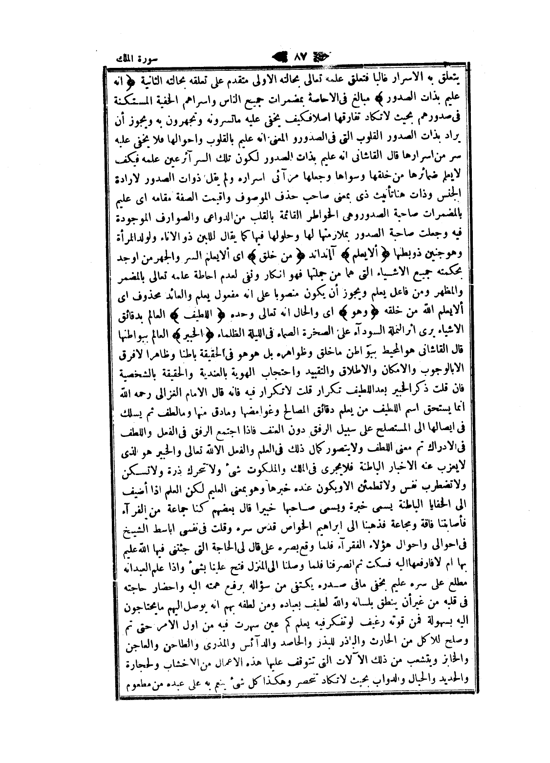 يتعلق به الاسرار غالبا فتعلق علمه تعالى بحالته الاولى متقدم على تعلقه بحالته الثانية إِنَّهُ عَلِيمٌ بِذاتِ الصُّدُورِ مبالغ فى الإحاطة بمضمرات جميع الناس وأسرارهم الخفية المستكنة فى صدورهم بحيث لا تكاد تفارقها أصلا فكيف يخفى عليه ما تسرونه وتجهرون به ويجوز أن يراد بذات الصدور القلوب التي فى الصدور والمعنى انه عليم بالقلوب وأحوالها فلا يخفى عليه سر من اسرارها قال القاشاني انه عليم بذات الصدور لكون تلك السرائر عين علمه فيكف لا يعلم ضمائرها من خلقها وسواها وجعلها مرآئى أسراره ولم يقل ذوات الصدور لارادة الجنس وذات هنا تأنيث ذى بمعنى صاحب حذف الموصوف وأقيمت الصفة مقامه اى عليم بالمضمرات صاحبة الصدور وهى الخواطر القائمة بالقلب من الدواعي والصوارف الموجودة فيه وجعلت صاحبة الصدور بملازمتها لها وحلولها فيها كما يقال للبن ذو الإناء ولولد المرأة وهو جنين ذو بطنها أَلا يَعْلَمُ آيا نداند مَنْ خَلَقَ اى ألا يعلم السر والجهر من أوجد بحكمته جميع الأشياء التي هما من جملتها فهو انكار ونفى لعدم احاطة علمه تعالى بالمضمر والمظهر ومن فاعل يعلم ويجوز أن يكون منصوبا على انه مفعول يعلم والعائد محذوف اى ألا يعلم الله من خلقه وَهُوَ اى والحال انه تعالى وحده اللَّطِيفُ العالم بدقائق الأشياء يرى اثر النملة السوداء على الصخرة الصماء فى الليلة الظلماء الْخَبِيرُ العالم ببواطنها قال القاشاني هو المحيط ببواطن ما خلق وظواهره بل هو هو فى الحقيقة باطنا وظاهرا لا فرق الا بالوجوب والإمكان والإطلاق والتقييد واحتجاب الهوية بالعندية والحقيقة بالشخصية فان قلت ذكر الخبير بعد اللطيف تكرار قلت لا تكرار فيه فانه قال الامام الغزالي رحمه الله انما يستحق اسم اللطيف من يعلم دقائق المصالح وغوامضها وما دق منها وما لطف ثم يسلك فى إيصالها الى المستصلح على سبيل الرفق دون العنف فاذا اجتمع الرفق فى الفعل واللطف فى الإدراك تم معنى اللطف ولا يتصور كمال ذلك فى العلم والفعل الا لله تعالى والخبير هو الذي لا يعزب عنه الاخبار الباطنة فلا يجرى فى الملك والملكوت شىء ولا تتحرك ذرة ولا تسكن ولا تضطرب نفس ولا تطمئن الا ويكون عنده خبرها وهو بمعنى العليم لكن العلم إذا أضيف الى الخفايا الباطنة يسمى خبرة ويسمى صاحبها خبيرا قال بعضهم كنا جماعة من الفراء فأصابتنا فاقة ومجاعة فذهبنا الى ابراهيم الخواص قدس سره وقلت فى نفسى اباسط الشيخ فى أحوالي واحوال هؤلاء الفقراء فلما وقع بصره على قال لى الحاجة التي جئتنى فيها الله عليم بها أم لا فارفعها اليه فسكت ثم انصرفنا فلما وصلنا الى المنزل فتح علينا بشئ وإذا علم العبد انه مطلع على سره عليم بخفي ما فى صدره يكتفى من سؤاله برفع همته اليه وإحضار حاجته فى قلبه من غير أن ينطق بلسانه والله لطيف بعباده ومن لطفه بهم انه يوصل إليهم ما يحتاجون اليه بسهولة فمن قوته رغيف لو تفكر فيه يعلم كم عين سهرت فيه من أول الأمر حتى تم وصلح للاكل من الحارث والباذر للبذر والحاصد والدائس والمذرى والطاحن والعاجن والخابز ويتشعب من ذلك الآلات التي تتوقف عليها هذه الأعمال من الأخشاب ولحجارة والحديد والحبال والدواب بحيث لا تكاد تنحصر وهكذا كل شىء ينعم به على عبده من مطعوم