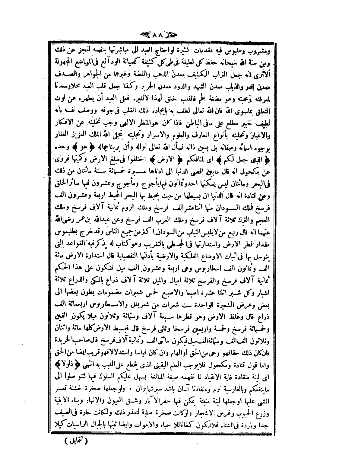 ومشروب وملبوس فيه مقدمات كثيرة لو احتاج العبد الى مباشرتها بنفسه لعجز عن ذلك ومن سنة الله سبحانه حفظ كل لطيفة فى طى كل كثيفة كصيانة الودائع فى المواضع المجهولة ألا ترى انه جعل التراب الكثيف معدن الذهب والفضة وغيرهما من الجواهر والصدف معدن الدر والذباب معدن الشهد والدود معدن الحرير وكذا جعل قلب العبد محلا ومعدنا لمعرفته ومحبته وهو مضغة لحم فالقلب خلق لهذا لا لغيره فعلى العبد أن يطهره عن لوث التعلق بما سوى الله فان الله تعالى لطف به بايجاده ذلك القلب فى جوفه ووصف نفسه بانه لطيف خبير مطلع على ما فى الباطن فاذا كان هو المنظر الإلهي وجب تخليته عن الافكار والأغيار وتحليته بأنواع المعارف والعلوم والاسرار وتجليته بتجلى الله الملك العزيز الغفار بوجوه أسمائه وصفاته بل بعين ذاته نسأل الله تعالى نواله وأن يرينا جماله هُوَ وحده الَّذِي جَعَلَ لَكُمُ اى لمنافعكم الْأَرْضَ اختلفوا فى مبلغ الأرض وكميتها فروى عن مكحول انه قال ما بين أقصى الدنيا الى أدناها مسيرة خمسمائة سنة مائتان من ذلك فى البحر ومائتان ليس يسكنها أحد وثمانون فيها يأجوج ومأجوج وعشرون فيها سائر الخلق وعن قتادة انه قال الدنيا ان بسيطها من حيث يحيط بها البحر المحيط اربعة وعشرون الف فرسخ فملك السودان منها اثنا عشر الف فرسخ وملك الروم ثمانية آلاف فرسخ وملك العجم والترك ثلاثة آلاف فرسخ وملك العرب الف فرسخ وعن عبد الله بن عمر رضى الله عنهما انه قال ربع من لا يلبس الثياب من السودان اكثر من جميع الناس وقد خرج بطليموس مقدار قطر الأرض واستدارتها فى المجسطي بالتقريب وهو كتاب له يذكر فيه القواعد التي يتوسل بها فى اثبات الأوضاع الفلكية والارضية بأدلتها التفصيلية قال استدارة الأرض مائة الف وثمانون الف اسطاربوس وهى اربعة وعشرون الف ميل فتكون على هذا الحكم ثمانية آلاف فرسخ والفرسخ ثلاثة أميال والميل ثلاثة آلاف ذراع بالمكي والذراع ثلاثة أشبار وكل شبر اثنتا عشرة إصبعا والإصبع خمس شعيرات مضمومات بطون بعضها الى بعض وعرض الشعيرة الواحدة ست شعرات من شعر بغل والاسطاربوس اربعمائة الف ذراع قال وغلظ الأرض وهو قطرها سبعة آلاف وستمائة وثلاثون ميلا يكون الفين وخمسمائة فرسخ وخمسة وأربعين فرسخا وثلثى فرسخ قال فبسيط الأرض كلها مائة واثنان وثلاثون الف الف وستمائة الف ميل فيكون مائتى الف وثمانية آلاف فرسخ قال صاحب الخريدة فان كان ذلك حقا فهو وحى من الحق او الهام وان كان قياسا واستدلالا فهو قريب ايضا من الحق واما قول قتادة ومكحول فلا يوجب العلم اليقيني الذي يقطع على الغيب به انتهى ذَلُولًا اى لينة منقادة غاية الانقياد لما تفهمه صيغة المبالغة يسهل عليكم السلوك فيها لتتوصلوا الى ما ينفعكم وبالفارسية نرم ومنقادتا آسان باشد سير شما بران. ولو جعلها صخرة خشنة تعسر المشي عليها او جعلها لينة منبتة يمكن فيها حفر الآبار وشق العيون والأنهار وبناء الابنية وزرع الحبوب وغرس الأشجار ولو كانت صخرة صلبة لتعذر ذلك ولكانت حارة فى الصيف جدا وباردة فى الشتاء فلا تكون كفاتا للاحياء والأموات وايضا ثبتها بالجبال الراسيات كيلا