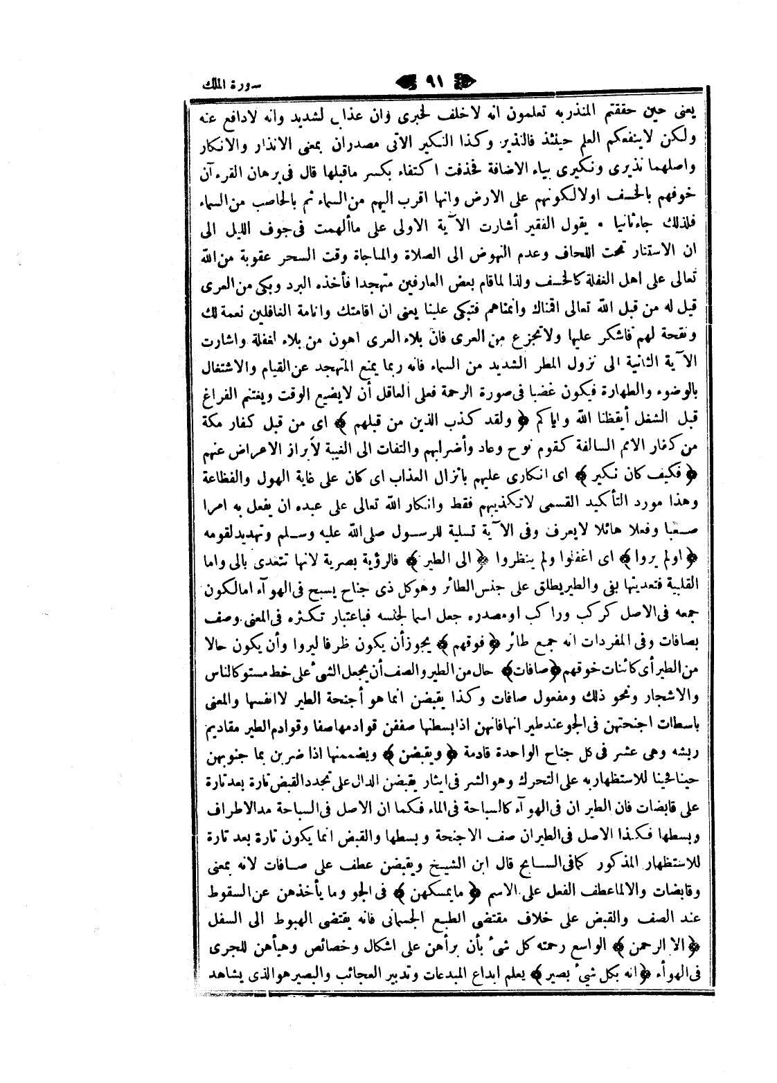 يعنى حين حققتم المنذر به تعلمون انه لا خلف لخبرى وان عذابى لشديد وانه لا دافع عنه ولكن لا ينفعكم العلم حينئذ فالنذير وكذا النكير الآتي مصدر ان بمعنى الانذار والإنكار وأصلهما نذيرى ونكيرى بياء الاضافة فحذفت اكتفاء بكسر ما قبلها قال فى برهان القرآن خوفهم بالخسف اولا لكونهم على الأرض وانها اقرب إليهم من السماء ثم بالحاصب من السماء فلذلك جاء ثانيا. يقول الفقير أشارت الآية الاولى على ما ألهمت فى جوف الليل الى ان الاستتار تحت اللحاف وعدم النهوض الى الصلاة والمناجاة وقت السحر عقوبة من الله تعالى على اهل الغفلة كالخسف ولذا لما قام بعض العارفين متهجدا فأخذه البرد وبكى من العرى قيل له من قبل الله تعالى أقمناك وأنمناهم فتبكى علينا يعنى ان اقامتك وانامة الغافلين نعمة لك ونقحة لهم فاشكر عليها ولا تجزع من العرى فان بلاء العرى أهون من بلاء لغفلة واشارت الآية الثانية الى نزول المطر الشديد من السماء فانه ربما يمنع المتهجد عن القيام والاشتغال بالوضوء والطهارة فيكون غضبا فى صورة الرحمة فعلى العاقل أن لا يضيع الوقت ويغتنم الفراغ قبل الشغل أيقظنا الله وإياكم وَلَقَدْ كَذَّبَ الَّذِينَ مِنْ قَبْلِهِمْ اى من قبل كفار مكة من كفار الأمم السالفة كقوم نوح وعاد وأضرابهم والتفات الى الغيبة لابراز الاعراض عنهم فَكَيْفَ كانَ نَكِيرِ اى إنكاري عليهم بانزال العذاب اى كان على غاية الهول والفظاعة وهذا مورد التأكيد القسمي لا تكذيبهم فقط وانكار الله تعالى على عبده ان يفعل به امرا صعبا وفعلا هائلا لا يعرف وفى الآية تسلية للرسول صلى الله عليه وسلم وتهديد لقومه أَوَلَمْ يَرَوْا اى اغفلوا ولم ينظروا إِلَى الطَّيْرِ فالرؤية بصرية لانها تتعدى بالى واما القلبية فتعديتها بفي والطير يطلق على جنس الطائر وهو كل ذى جناح يسبح فى الهولء اما لكون جمعه فى الأصل كركب وراكب او مصدره جعل اسما لجنسه فباعتبار تكثره فى المعنى وصف بصافات وفى المفردات انه جمع طائر فَوْقَهُمْ يجوز أن يكون ظرفا ليروا وأن يكون حالا من الطير أي كائنات خوقهم صافَّاتٍ حال من الطير والصف أن يجعل الشيء على خط مستو كالناس والأشجار ونحو ذلك ومفعول صافات وكذا يقبضن انما هو أجنحة الطير لا أنفسها والمعنى باسطات أجنحتهن فى الجو عند طيرانها فانهن إذا بسطنها صففن قوادمها صفا وقوادم الطير مقاديم ربشه وهى عشر فى كل جناح الواحدة قادمة وَيَقْبِضْنَ ويضممنها إذا ضربن بما جنوبهن حينا فحينا للاستظهار به على التحرك وهو الشر فى إيثار يقبضن الدال على تجدد القبض تارة بعد تارة على قابضات فان الطيران فى الهولء كالسباحة فى الماء فكما ان الأصل فى السباحة مد الأطراف وبسطها فكذا الأصل فى الطيران صف الاجنحة وبسطها والقبض انما يكون تارة بعد تارة للاستظهار المذكور كما فى السابح قال ابن الشيخ ويقبضن عطف على صافات لانه بمعنى وقابضات والا لما عطف الفعل على الاسم ما يُمْسِكُهُنَّ فى الجو وما يأخذهن عن السقوط عند الصف والقبض على خلاف مقتضى الطبع الجسماني فانه يقتضى الهبوط الى السفل إِلَّا الرَّحْمنُ الواسع رحمته كل شىء بأن برأهن على إشكال وخصائص وهيأهن للجرى فى الهواء إِنَّهُ بِكُلِّ شَيْءٍ بَصِيرٌ يعلم إبداع المبدعات وتدبير العجائب والبصير هو الذي يشاهد
