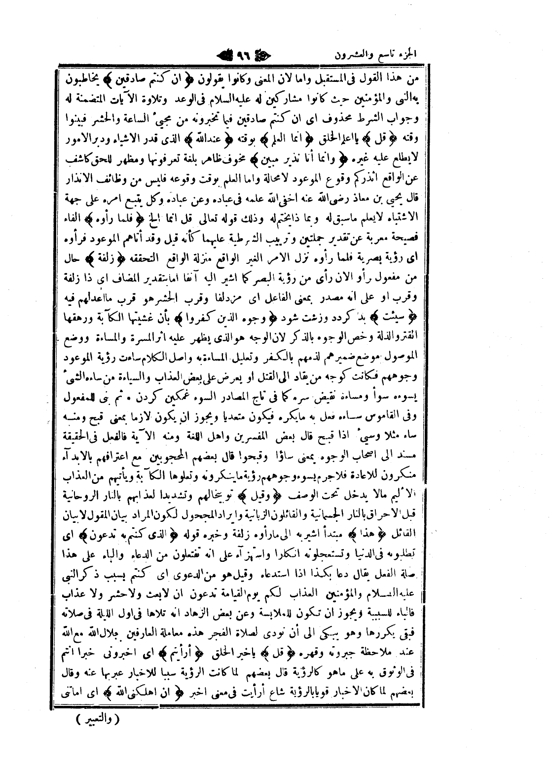من هذا القول فى المستقبل واما لان المعنى وكانوا يقولون إِنْ كُنْتُمْ صادِقِينَ يخاطبون به النبي والمؤمنين حيث كانوا مشاركين له عليه السلام فى الوعد وتلاوة الآيات المتضمنة له وجواب الشرط محذوف اى ان كنتم صادقين فيما تخبرونه من مجيئ الساعة والحشر فبينوا وقته قُلْ يا اعلم الخلق إِنَّمَا الْعِلْمُ بوقته عِنْدَ اللَّهِ الذي قدر الأشياء ودبر الأمور لا يطلع عليه غيره وَإِنَّما أَنَا نَذِيرٌ مُبِينٌ مخوف ظاهر بلغة تعرفونها ومظهر للحق كاشف عن الواقع أنذركم وقوع الموعود لا محالة واما العلم بوقت وقوعه فليس من وظائف الانذار قال يحيى بن معاذ رضى الله عنه أخفى الله علمه فى عباده وعن عباده وكل يتبع امره على جهة الاشتباه لا يعلم ما سبق له وبماذا يختم له وذلك قوله تعالى قل انما إلخ فَلَمَّا رَأَوْهُ الفاء فصيحة معربة عن تقدير جملتين وترييب الشرطية عليهما كأنه قيل وقد أتاهم الموعود فرأوه اى رؤية بصرية فلما رأوه نزل الأمر الغير الواقع منزلة الواقع لتحققه زُلْفَةً حال من مفعول رأو الان رأى من رؤية البصر كما أشير اليه آنفا اما بتقدير المضاف اى ذا زلفة وقرب او على انه مصدر بمعنى الفاعل اى مزدلفا وقرب الحشر هو قرب ما أعد لهم فيه سِيئَتْ بد كردد وزشت شود وُجُوهُ الَّذِينَ كَفَرُوا بأن غشيتها الكآبة ورهقها القتر والذلة وخص الوجوه بالذكر لان الوجه هو الذي يظهر عليه اثر المسرة والمساءة ووضع الموصول موضع ضميرهم لذمهم بالكفر وتعليل المساءة به واصل الكلام ساءت رؤية الموعود وجوههم فكانت كوجه من يقاد الى القتل او يعرض على بعض العذاب والسياءة من ساءه الشيء يسوءه سوأ ومساءة نقيض سره كما فى تاج المصادر السوء غمكين كردن. ثم بنى للمفعول وفى القاموس ساءه فعل به ما يكره فيكون متعديا ويجوز ان يكون لازما بمعنى قبح ومنه ساء مثلا وسيئ إذا قبح قال بعض المفسرين واهل اللغة ومنه الآية فالفعل فى الحقيقة مسند الى اصحاب الوجوه بمعنى ساءوا وقبحوا قال بعضهم المحجوبين مع اعترافهم بالابداء منكرون للاعادة فلا جرم يسوء وجوههم رؤية ما ينكرونه وتعلوها الكآبة ويأتيهم من العذاب الأليم ما لا يدخل تحت الوصف وَقِيلَ توبيخا لهم وتشديدا لعذابهم بالنار الروحانية قبل الإحراق بالنار الجسمانية والقائلون الزبانية وإيراد المجحول لكون المراد بيان المقول لا بيان القائل هذَا مبتدأ أشير به الى ما رأوه زلفة وخبره قوله الَّذِي كُنْتُمْ بِهِ تَدَّعُونَ اى تطلبونه فى الدنيا وتستعجلونه إنكارا واستهزاء على انه تفتعلون من الدعاء والباء على هذا صلة الفعل يقال دعا بكذا إذا استدعاه وقيل هو من الدعوى اى كنتم بسبب ذكر النبي عليه السلام والمؤمنين العذاب لكم يوم القيامة تدعون ان لا بعث ولا حشر ولا عذاب فالباء للسببية ويجوز ان تكون للملابسة وعن بعض الزهاد انه تلاها فى أول الليلة فى صلاته فبقى يكررها وهو يبكى الى أن نودى لصلاة الفجر هذه معاملة العارفين بجلال الله مع الله عند ملاحظة جبروته وقهره قُلْ يا خير الخلق أَرَأَيْتُمْ اى أخبروني خبرا أنتم فى الوثوق به على ما هو كالرؤية قال بعضهم لما كانت الرؤية سببا للاخبار عبربها عنه وقال بعضهم لما كان الاخبار قويا بالرؤية شاع أرأيت فى معنى اخبر إِنْ أَهْلَكَنِيَ اللَّهُ اى أماتني