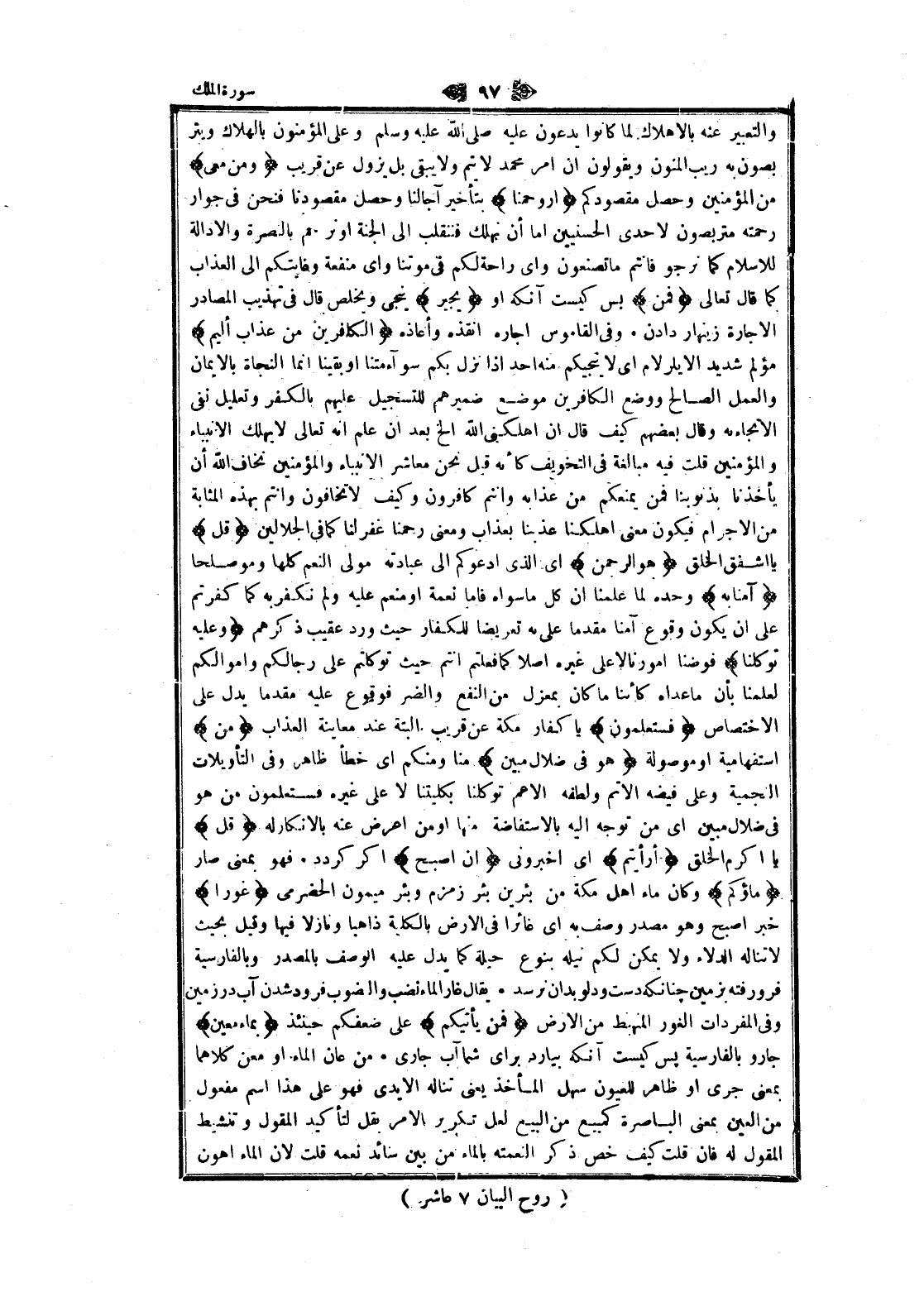 والتعبير عنه بالإهلاك لما كانوا يدعون عليه صلى الله عليه وسلم وعلى المؤمنون بالهلاك ويتر بصون به ريب المنون ويقولون ان امر محمد لا يتم ولا يبقى بل يزول عن قريب وَمَنْ مَعِيَ من المؤمنين وحصل مقصودكم أَوْ رَحِمَنا بتأخير آجالنا وحصل مقصودنا فنحن فى جوار رحمته متربصون لاحدى الحسنيين اما أن نهلك فننقلب الى الجنة او نرحم بالنصرة والادالة للاسلام كما نرجو فانتم ما تصنعون واى راحة لكم فى موتنا واى منفعة وغايتكم الى العذاب كما قال تعالى فَمَنْ بس كيست آنكه او يُجِيرُ ينجى ويخلص قال فى تهذيب المصادر الاجارة زينهار دادن. وفى القاموس اجاره أنقذه وأعاذه الْكافِرِينَ مِنْ عَذابٍ أَلِيمٍ مؤلم شديد الا؟؟؟ يلرلام اى لا ينجيكم منه أحد إذا نزل بكم سوآء متنا او بقينا انما النجاة بالايمان والعمل الصالح ووضع الكافرين موضع ضميرهم للتسجيل عليهم بالكفر وتعليل نفى الانجاء به وقال بعضهم كيف قال ان أهلكني الله إلخ بعد ان علم انه تعالى لا يهلك الأنبياء والمؤمنين قلت فيه مبالغة فى التخويف كأنه قيل نحن معاشر الأنبياء والمؤمنين نخاف الله أن يأخذنا بذنوبنا فمن يمنعكم من عذابه وأنتم كافرون وكيف لا تخافون وأنتم بهذه المثابة من الاجرام فيكون معنى أهلكنا عذبنا بعذاب ومعنى رحمنا غفر لنا كما فى الجلالين قُلْ يا اشفق الخلق هُوَ الرَّحْمنُ اى الذي أدعوكم الى عبادته مولى النعم كلها وموصلحا آمَنَّا بِهِ وحده لما علمنا ان كل ما سواه فاما نعمة او منعم عليه ولم نكفر به كما كفرتم على ان يكون وقوع آمنا مقدما على به تعريضا للكفار حيث ورد عقيب ذكرهم وَعَلَيْهِ تَوَكَّلْنا فوضنا أمورنا لا على غيره أصلا كما فعلتم أنتم حيث توكلتم على رجالكم وأموالكم لعلمنا بأن ما عداه كائنا ما كان بمعزل من النفع والضر فوقوع عليه مقدما يدل على الاختصاص فَسَتَعْلَمُونَ يا كفار مكة عن قريب البتة عند معاينة العذاب مَنْ استفهامية او موصولة هُوَ فِي ضَلالٍ مُبِينٍ منا ومنكم اى خطأ ظاهر وفى التأويلات النجمية وعلى فيضة الأتم ولطفه الأعم توكلنا بكليتنا لا على غيره فستعلمون من هو فى ضلال مبين اى من توجه اليه بالاستفاضة منها او من اعرض عنه بالإنكار له قُلْ يا أكرم الخلق أَرَأَيْتُمْ اى أخبروني إِنْ أَصْبَحَ اگر كردد. فهو بمعنى صار ماؤُكُمْ وكان ماء اهل مكة من بئرين بئر زمزم وبئر ميمون الحضرمي غَوْراً خبر أصبح وهو مصدر وصف به اى غائرا فى الأرض بالكلية ذاهبا ونازلا فيها وقيل بحيث لا تناله الدلاء ولا يمكن لكم نيله بنوع حيلة كما يدل عليه الوصف بالمصدر وبالفارسية فرو رفته بزمين چنانكه دست ودلو بدان نرسد. يقال غار الماء نضب والنضوب فرود شدن آب در زمين وفى المفردات الغور المنهبط من الأرض فَمَنْ يَأْتِيكُمْ على ضعفكم حينئذ بِماءٍ مَعِينٍ جار وبالفارسية پس كيست آنكه بيارد براى شما آب جارى. من عان الماء او معن كلاهما بمعنى جرى او ظاهر للعيون سهل المأخذ يعنى تناله الأيدي فهو على هذا اسم مفعول من العين بمعنى الباصرة كمبيع من البيع لعل تكرير الأمر بقل لتأكيد المقول وتنشيط المقول له فان قلت كيف خص ذكر النعمة بالماء من بين سائد نعمه قلت لان الماء أهون