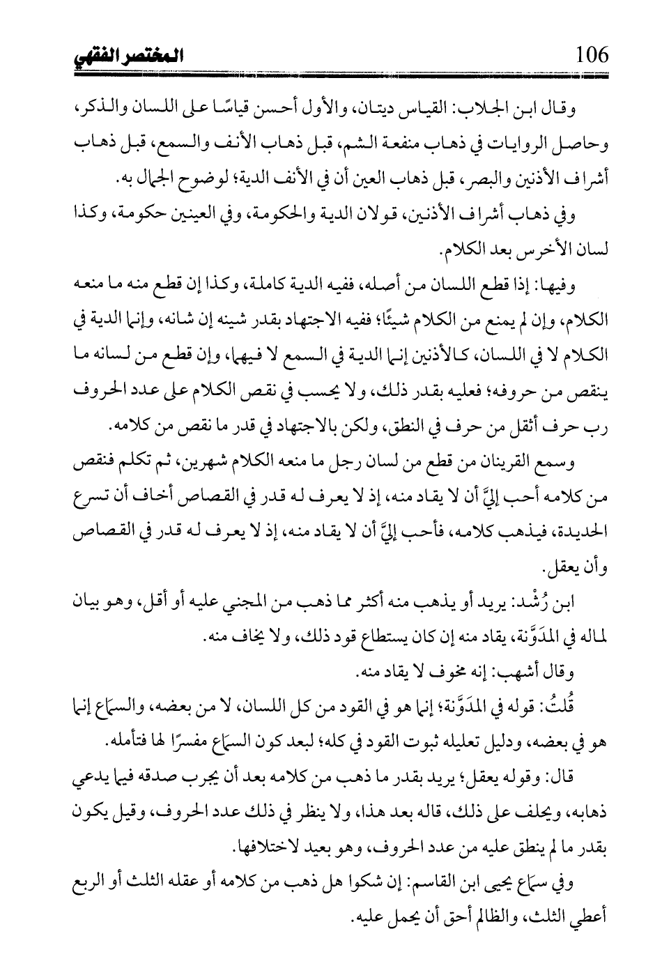 وسمع القرينان من قطع من لسان رجل ما منعه الكلام شهرين، ثم تكلم فنقص من كلامه أحب الىّ أن يقاد منه، إذ لا يعرف له قدر في القصاص أخاف أن تسرع الحديدة، فيذهب كلامه، فأحب الىّ أن لا يقاد منه، إذ لا يعرف له قدر في القصاص وأن يعقل.