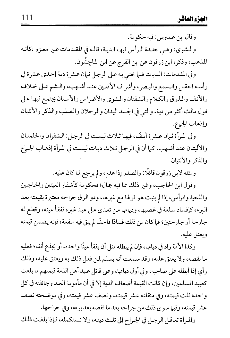 وقول ابن الحاجب، وغير ذلك مما فيه جمال؛ فحكومة كأشفار والعينين والحاجبين واللحية والرأس، إذا لم ينبت هو قالها مع غيرها، وذو الرق جراحه معتبرة بقيمته بعد البرء، كإفساد سلعة في غصبها، ودياتها من تعدى على عبد غيره ففقأ عينه، وقطع له جارحة أو جارحتين؛ فما كان من ذلك فساداً فاحشاً لم بق فيه منفعة، فإنه يضمن قيمته ويعتق عليه.
