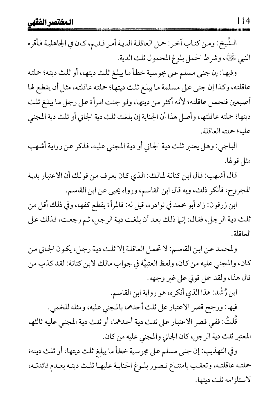 ولمحمد عن ابن القاسم: لا تحمل العاقلة إلا ثلث دية رجل، يكون الجاني من كان، والمجني عليه من كان، ولفظ العتبيَّة في جواب مالك لابن كنانة: لقد كذب من قال هذا، ولقد حمل قولي على غير وجهه.