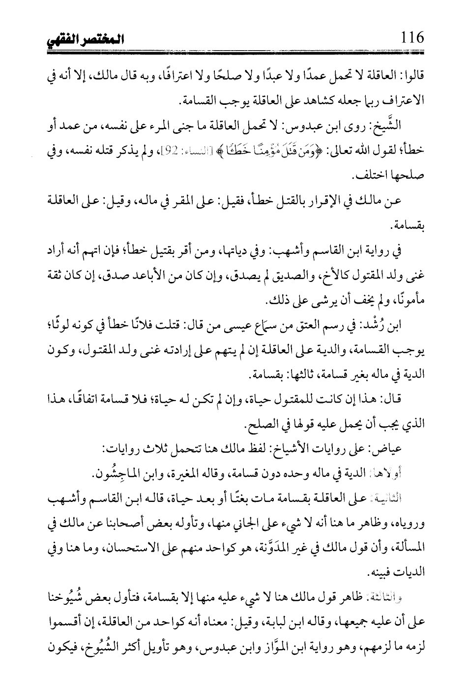 الثانية: على العاقلة بقسامة مات بغتًا أو بعد حياة، قاله ابن القاسم وأشهب وروياه، وظاهر ما هنا أنه لا شيء على الجاني منها، وتأوله بعض أصحابنا عن مالك في المسألة، وأن قول مالك في غير المدونة، هو كواحد منهم على الاستحسان، وما هنا وفي الديات فبينه.