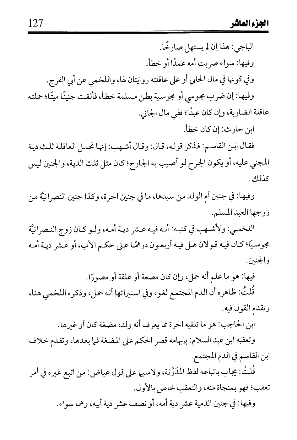 فقال ابن القاسم: فذكر قوله، قال: وقال أشهب: إنها تحمل العاقلة ثلث دية المجني عليه، أو يكون الجرح لو أصيب به الجارح؛ كان مثل ثلث الدية، والجنين ليس كذلك.