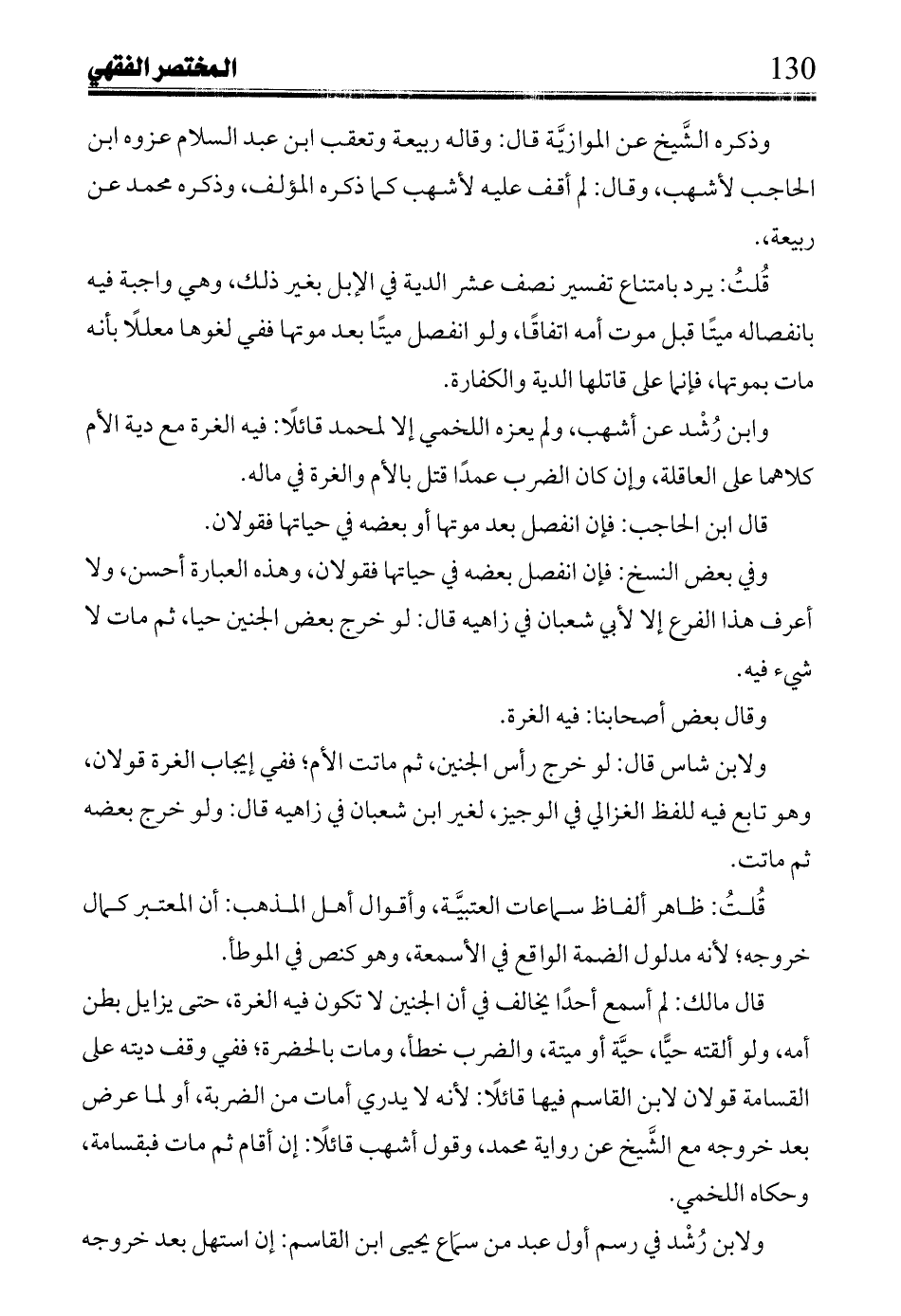 وابن رشد عن أشهب، ولم يعزه اللخمي إلا لمحمد قائلًا: فيه الغرة مع دية الأم كلاهما على العاقلة، وإن كان الضرب عمدًا قتل بالأم والغرة في ماله.