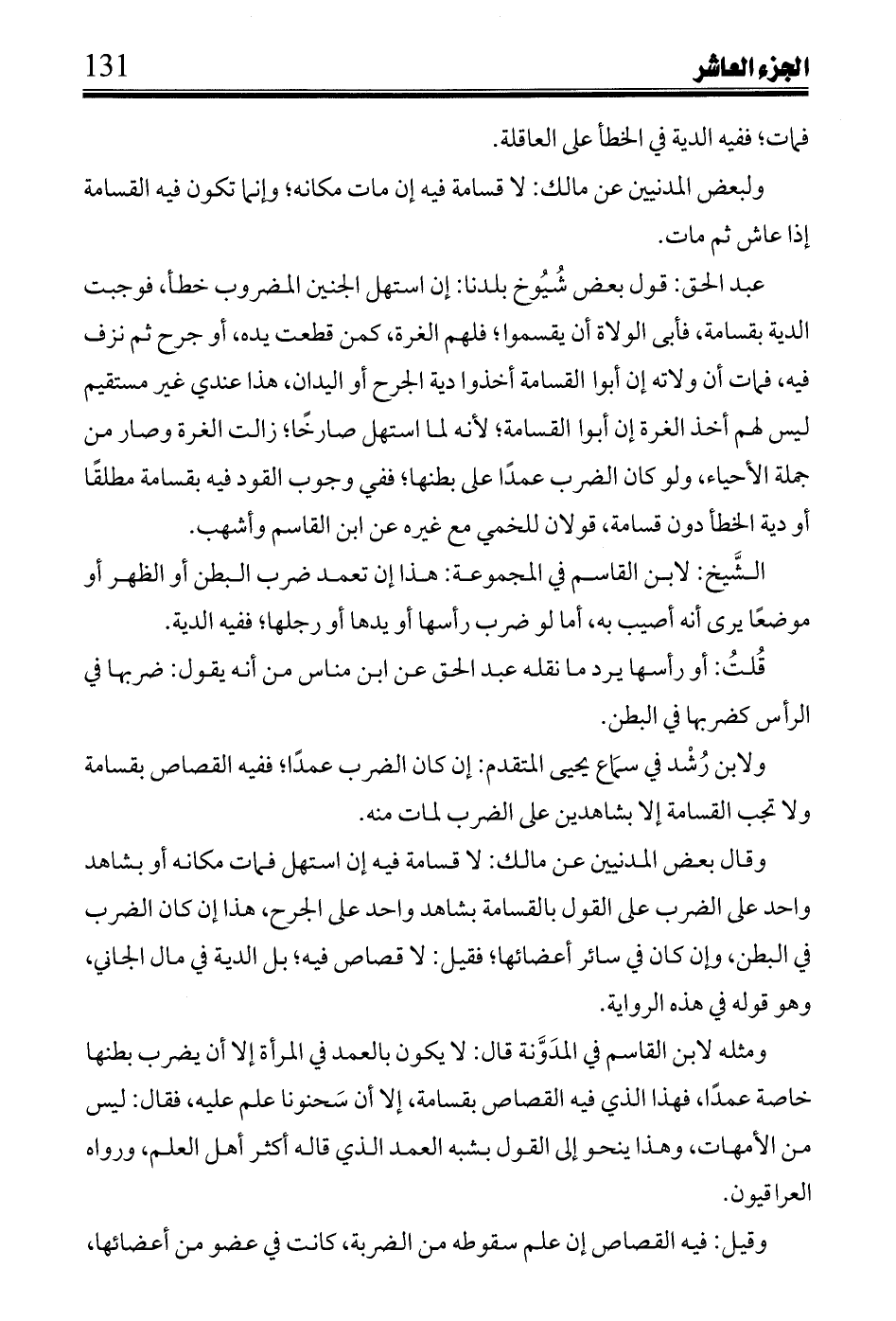 ومثله لابن القاسم في المدونة قال: لا يكون بالعمد في المرأة إلا أن يضرب بطنها خاصة عمدًا، فهذا الذي فيه القصاص بقسامة، إلا أن سحنونا علم عليه، فقال: ليس من الأمهات، وهذا ينحو إلى القول بشبه العمد الذي قاله أكثر أهل العلم، ورواه العراقيون.