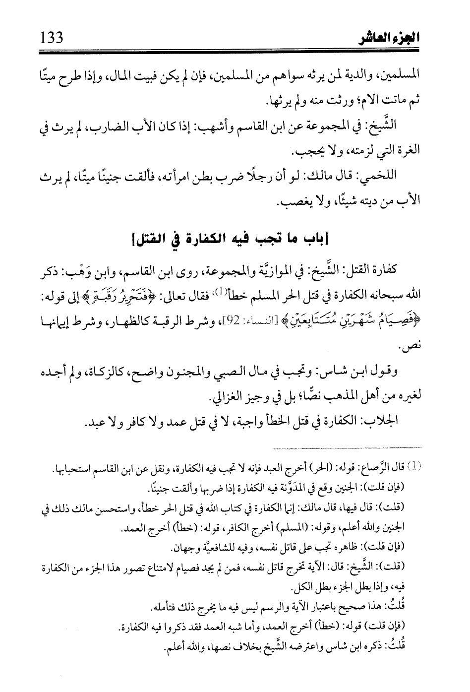 كفارة القتل: الشيخ: في الموازية والمجموعة، روى ابن القاسم، وابن وهب: ذكر الله سبحانه الكفارة في قتل الحر المسلم خطأ، فقال تعالى: {فَتَحْرِيرُ رَقَبَةٍ} إلى قوله: {فَصِيَامُ شَهْرَيْنِ مُتَتَابِعَيْنِ} [النساء: 92]، وشرط الرقبة كالظهار، وشرط إيمانها نص.