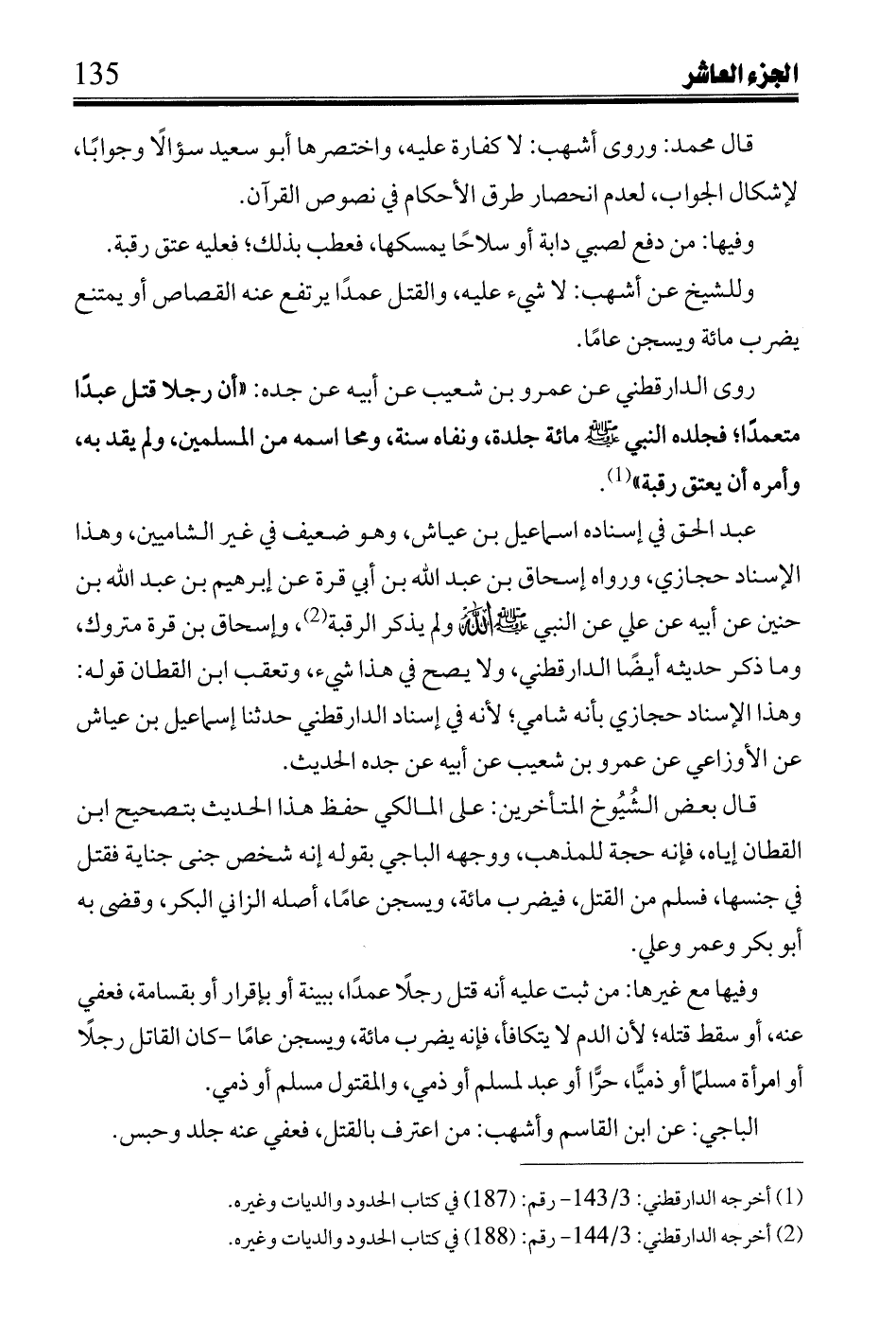 عبد الحق في إسناده اسماعيل بن عياش، وهو ضعيف في غير الشاميين، وهذا الإسناد حجازي، ورواه إسحاق بن عبد الله بن أبي قرة عن إبراهيم بن عبد الله بن حنين عن أبيه عن علي عن النبي صلى الله عليه وسلم ولم يذكر الرقبة، وإسحاق بن قرة متروك، وما ذكر حديثه أيضًا الدارقطني، ولا يصح في هذا شيء، وتعقب ابن القطان قوله: وهذا الإسناد حجازي بأنه شامي؛ لأنه في إسناد الدارقطني حدثنا إسماعيل بن عياش عن الأوزاعي عن عمرو بن شعيب عن أبيه عن جده الحديث.