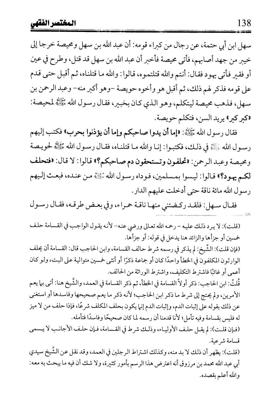 سهل ابن أبي حتمة، عن رجال من كبراء قومه: أن عبد الله بن سهل ومحيصة خرجا إلى خيبر من جهد أصابهم، فأتى محيصة فأخبر أن عبد الله بن سهل قد قتل، وطرح في عين أو فقير فأتى يهود فقال: أنتم والله قتلنموه، قالوا: والله ما قتلناه، ثم أقبل حتى قدم على قومه فذكر لهم ذلك، ثم أقبل هو وأخوه حويصة - وهو أكبر منه - وعبد الرحمن بن سهل، فذهب محيصة ليتكلم، وهو الذي كان بخبير، فقال رسول الله صلى الله عليه وسلم لمحيصة: "كبر كبر" يريد السن، فتكلم حويصة.