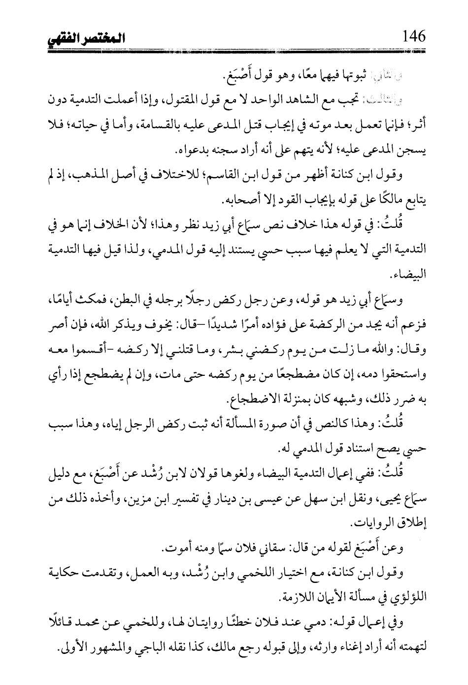 قلت: ففي إعمال التدمية البيضاء ولغوها قولان لابن رشد عن أصبغ، مع دليل سماع يحيى، ونقل ابن سهل عن عيسىبن دينا في تفسير ابن مزين، وأخذه ذلك من إطلاق الروايات.