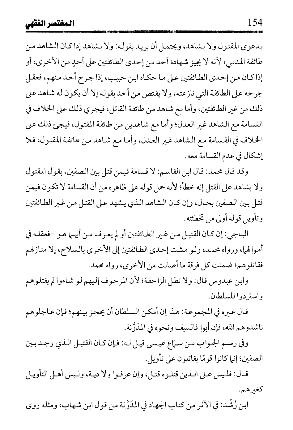 الباجي: إن كان القتيل من غير الطائفتين أو لم يعرف من أيهما هو -فعقله في أموالهما، ورواه محمد، ولو مشت إحدى الطائفتين إلى الأخري بالسلاح، إلا منازلهم فقاتلوهم؛ ضمنت كلفرقة ما أصابت من الأخرى، رواه محمد.