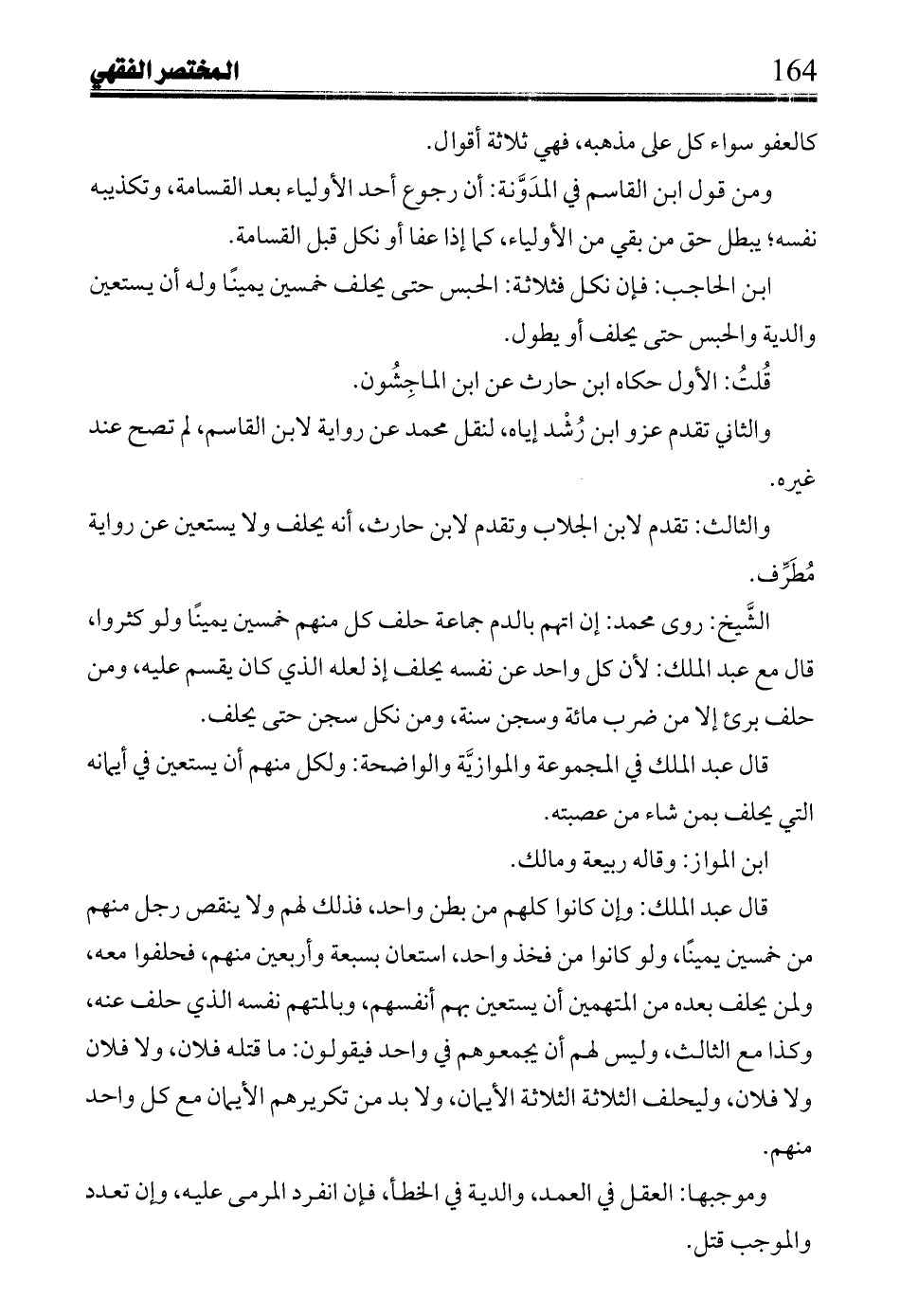 ابن الحاجب: فإن نكل فثلاثة: الحبس حتى يحلف خمسين يميناً وله أن يستعين والدية والحبس حتى يحلف أو يطول.