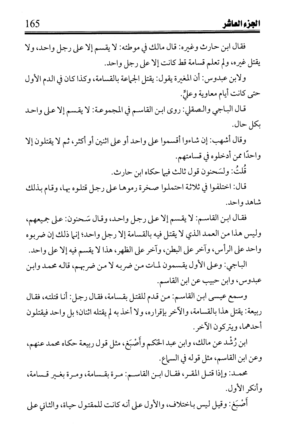 فقال ابن حارث وغيره: قال مالك في موطئه: لايقسم إلا على رجل واحد، ولا يقتل غيره، ولم تعلم قسامة قط كانت إلا على رجل واحد.