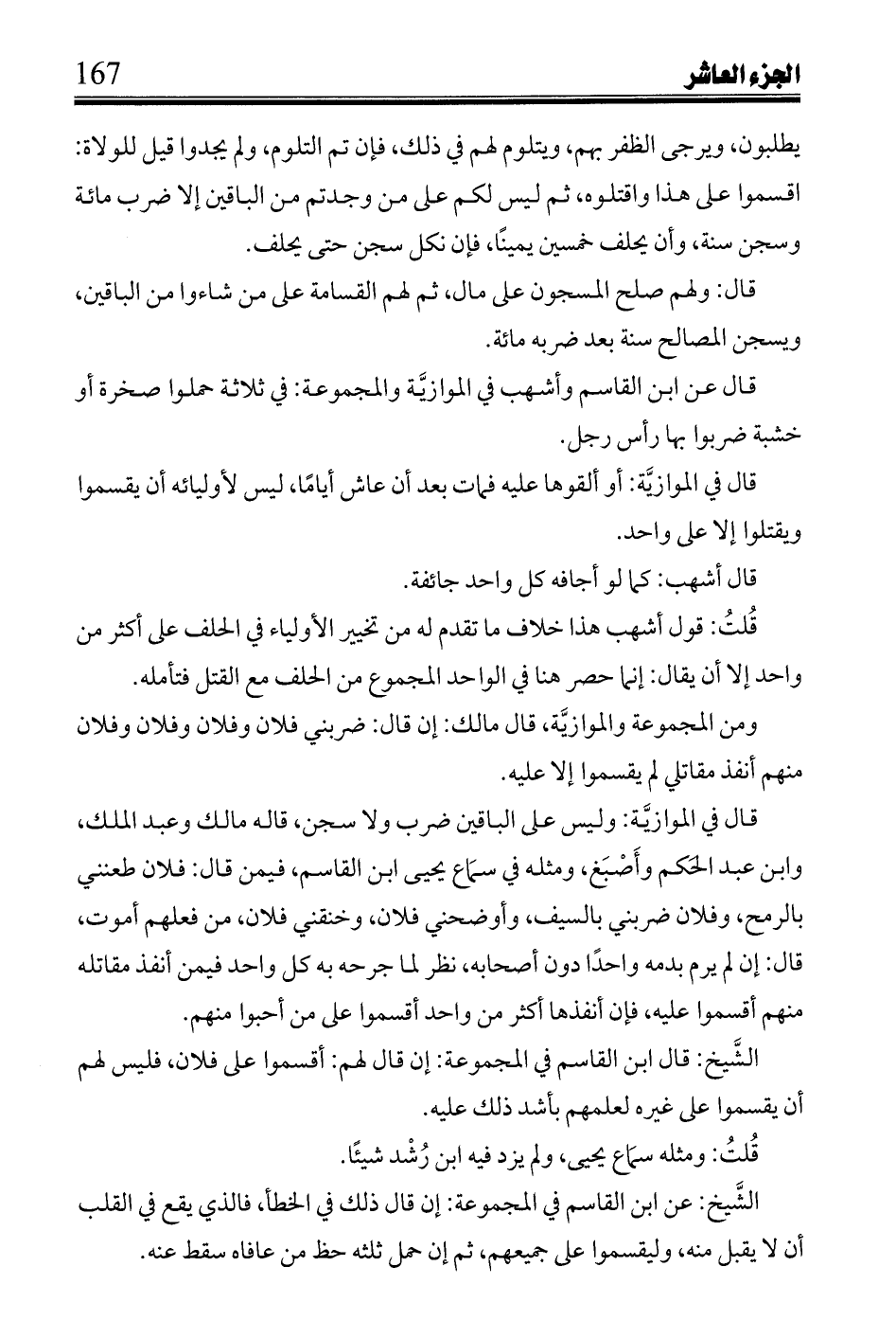 قال فيى الموازية: وليس على الباقين ضرب ولاسجن، قاله مالك وعبد المبلك، وابن عبد الحكم وأصبغ، ومثله في سماع يحيى ابن القاسم، فيمن قال: فلان طعننى بالرمح، وفلان ضربني بالسيف، وأوضحني فلان، وخنقني فلان، من فعلهم أموت، قال: إن لم يرم بدمه واحداً دون أصحابه، نظر لما جرحه به كل واحد فيمن أنفذ مقاتله منهم أقسموا عليه، فإن أنفذها أكثر من واحد أقسموا على من أحبوا منهم.