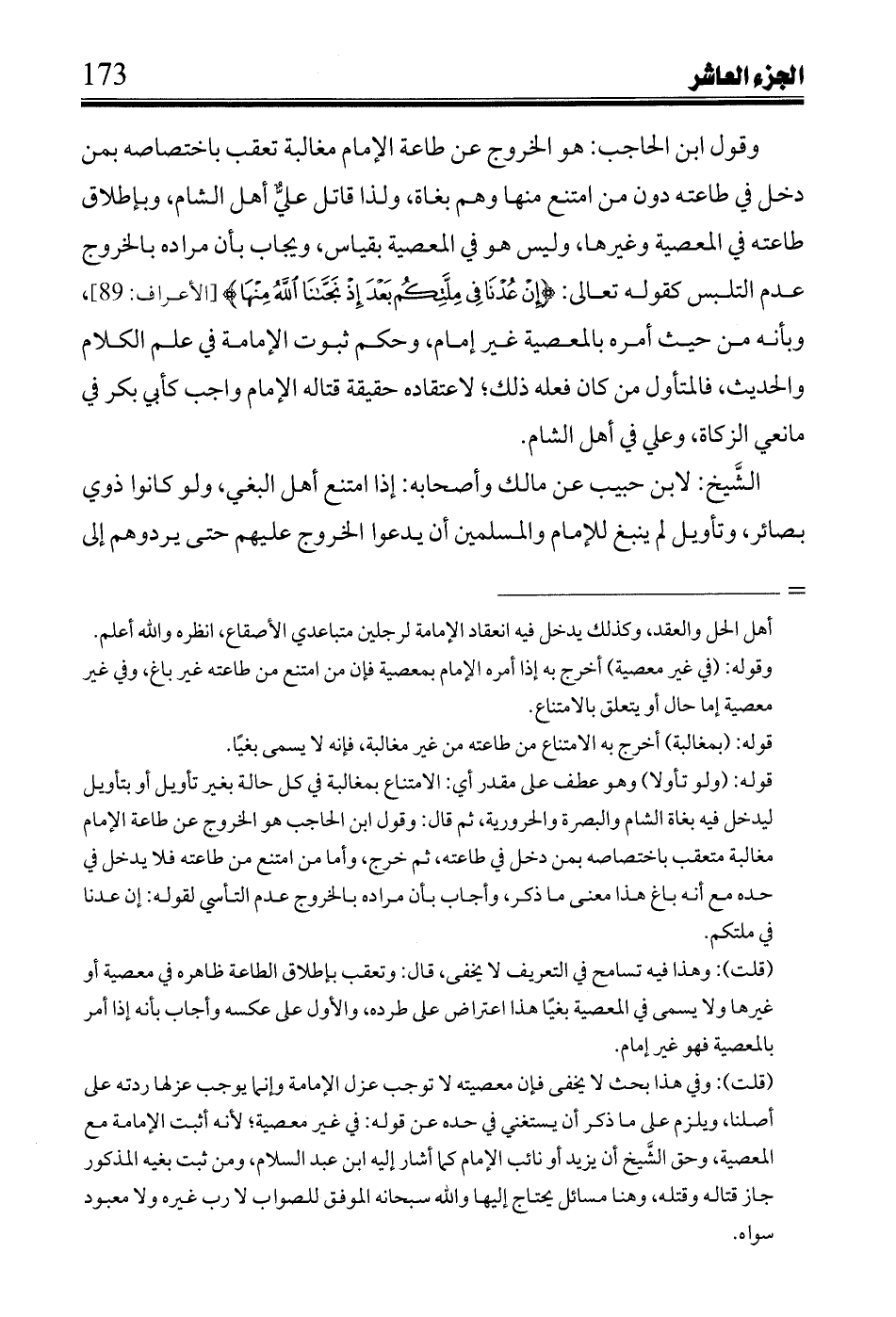 وقول ابن الحاجب: هو الخروج عن طاعة الإمام مغالبة تعقب باختصاصه بمن دخل في طاعته دون من إمتنع منها وهم بغاة، ولذا قاتل عليٌ أهل الشام، وبإطلاق طاعته في المعصية وغيرها، وليس هو في المعصية بقياس، ويجاب بأن مراده بالخروج عدم التلبس كقوله تعالى: (إن عدنا في ملتكم بعد إذ نجنا الله منها) [الأعراف: 89]، وبأنه من حيث أمره بالمعصية غير إمام، وحكم ثبوت الإمامة في علم الكلام والحديث، فالمتأول من كان فعله ذلك؛ لإعتقاده حقيقة قتاله الإمام واجب كأبي بكر في مانعي الزكاة، وعلي في أهل الشام.