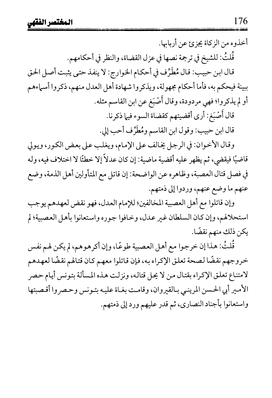 وقال الأخوان: في الرجل يخالف على الإمام، ويغلب على بعض الكور، ويولي قاضيًا فيقضي، ثم يظهر على أقضية ماضية: إن كان عدلًا إلا خطئًا لا اختلاف فيه، وله في فصل قتال العصبة، وظاهره عن الواضحة: إن قاتل مع المتأولين أهل الذمة، وضع عنهم ما وضع عنهم، وردوا إلى ذمتهم.