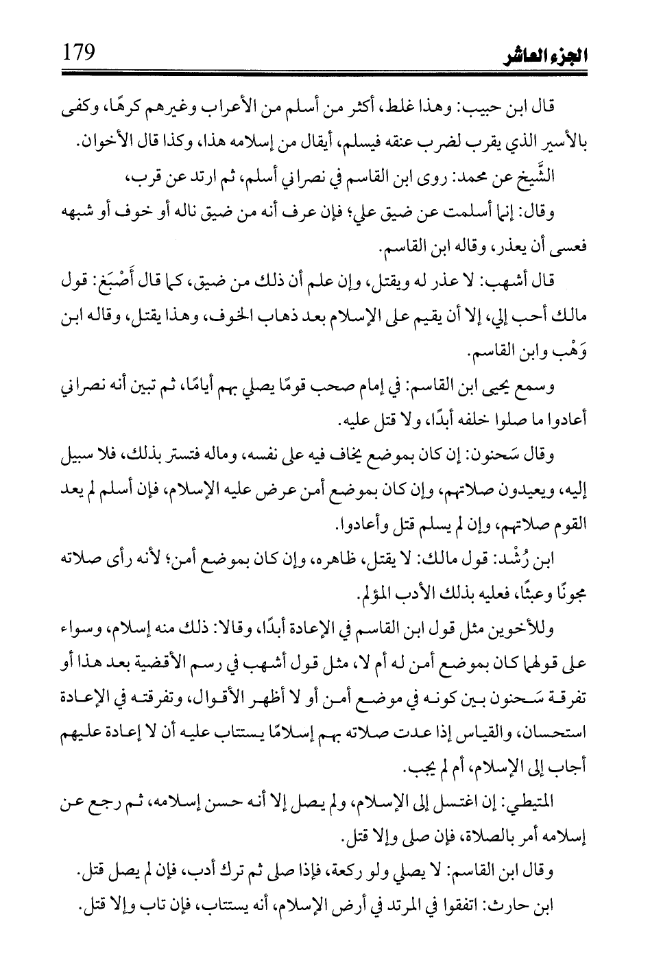 قال أشهب: لا عذر له ويقتل، وإن علم أن ذلك من ضيق، كما قال أَصْبغ: قول مالك أحب إلي، إلا أن يقيم على الإسلام بعد ذهاب الخوف، وهذا يقتل، وقاله ابن وَهْب وابن القاسم.