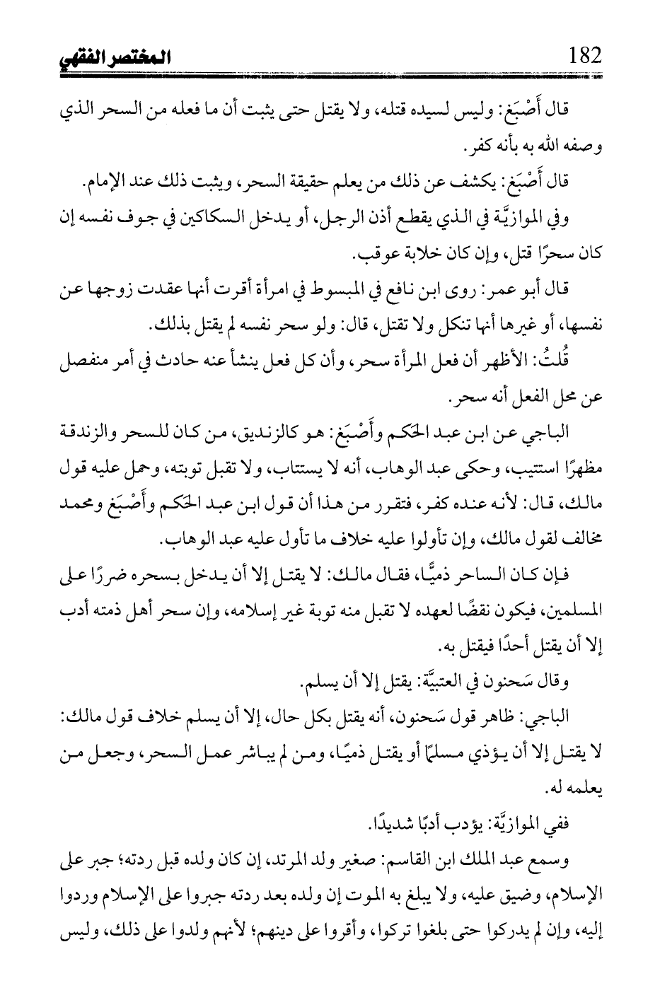 الباجي عن ابن عبد الحكم وأصبغ: هو كالزنديق، من كان للسحر والزندقة مظهراً استتيب، وحكى عبد الوهاب، أنه لا يستتاب، ولا تقبل توبته، وحمل عليه قول مالك، قال: لأنه عنده كفر، فتقرر من هذا أن قول ابن عبد الحكم وأصبغ ومحمد مخالف لقول مالك، وإن تأولوا عليه خلاف ما تأول عليه عبد الوهاب.
