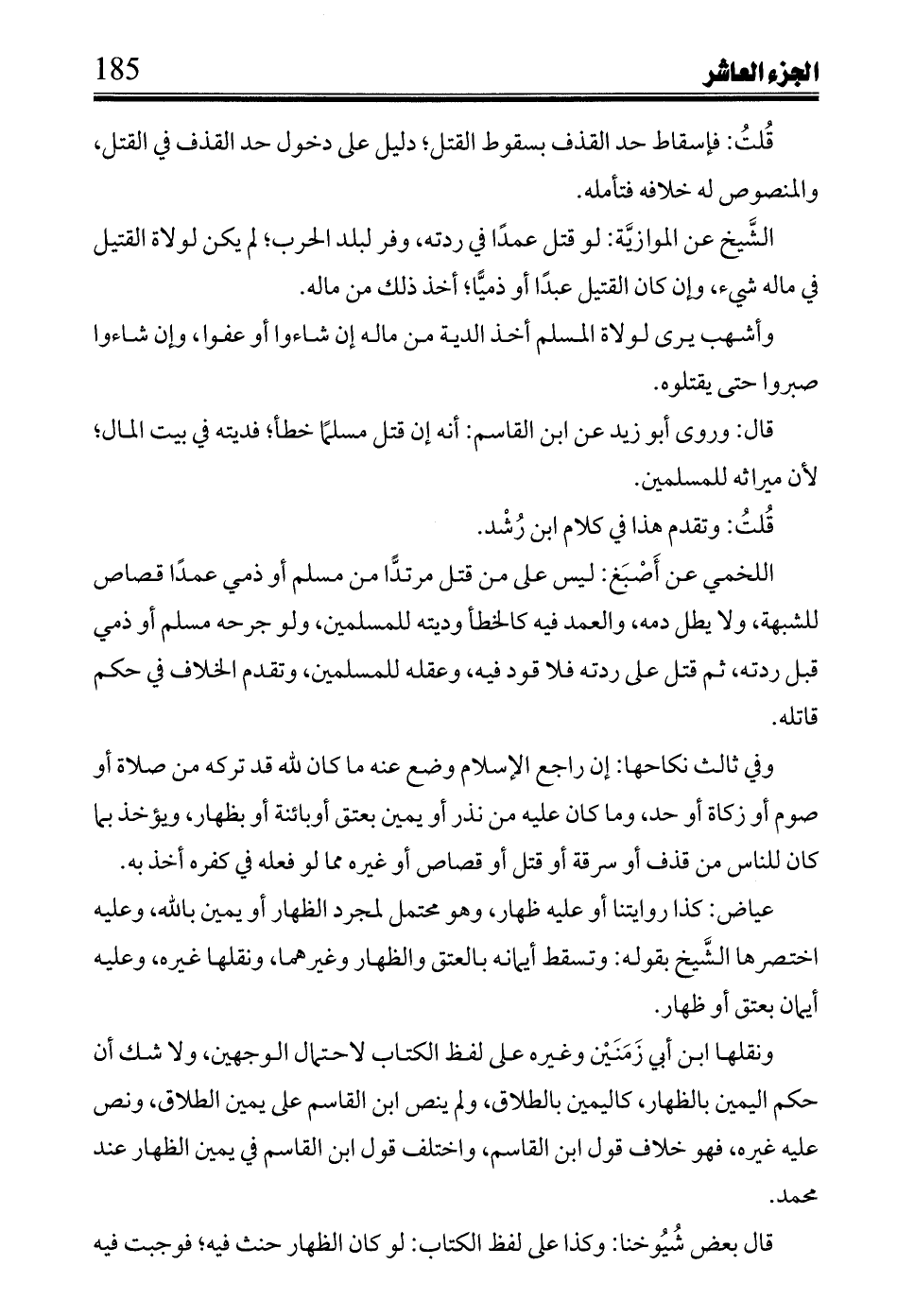 اللخمي عن أصبغ: ليس على من قتل مرتداً من مسلم أو ذمي عمداً قصاص للشبهة، ولا يطل دمه، والعمد فيه كالخطأ وديته للمسلمين، ولو جرحه مسلم أو ذمي قبل ردته، ثم قتل على ردته فلا قود فيه، وعقله للمسلمين، وتقدم الخلاف في حكم قاتله.