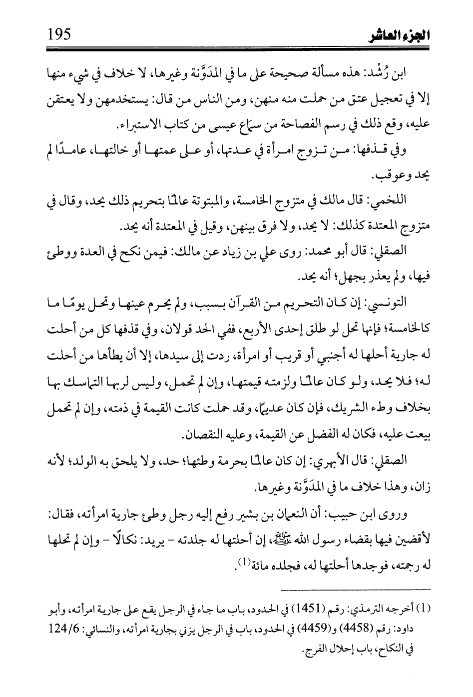 وروى ابن حبيب: أن النعمان بن بشير رفع إليه رجل وطئ جارية امرأتة، فقال: لأقضين فيها بقضاء رسول الله صلى الله عليه وسلم، إن أحلتها له جلدته- يرد: نكالاً- وإن لم تحلها له رجمته، فوجدها أحلتها له، فجلده مائة (1).