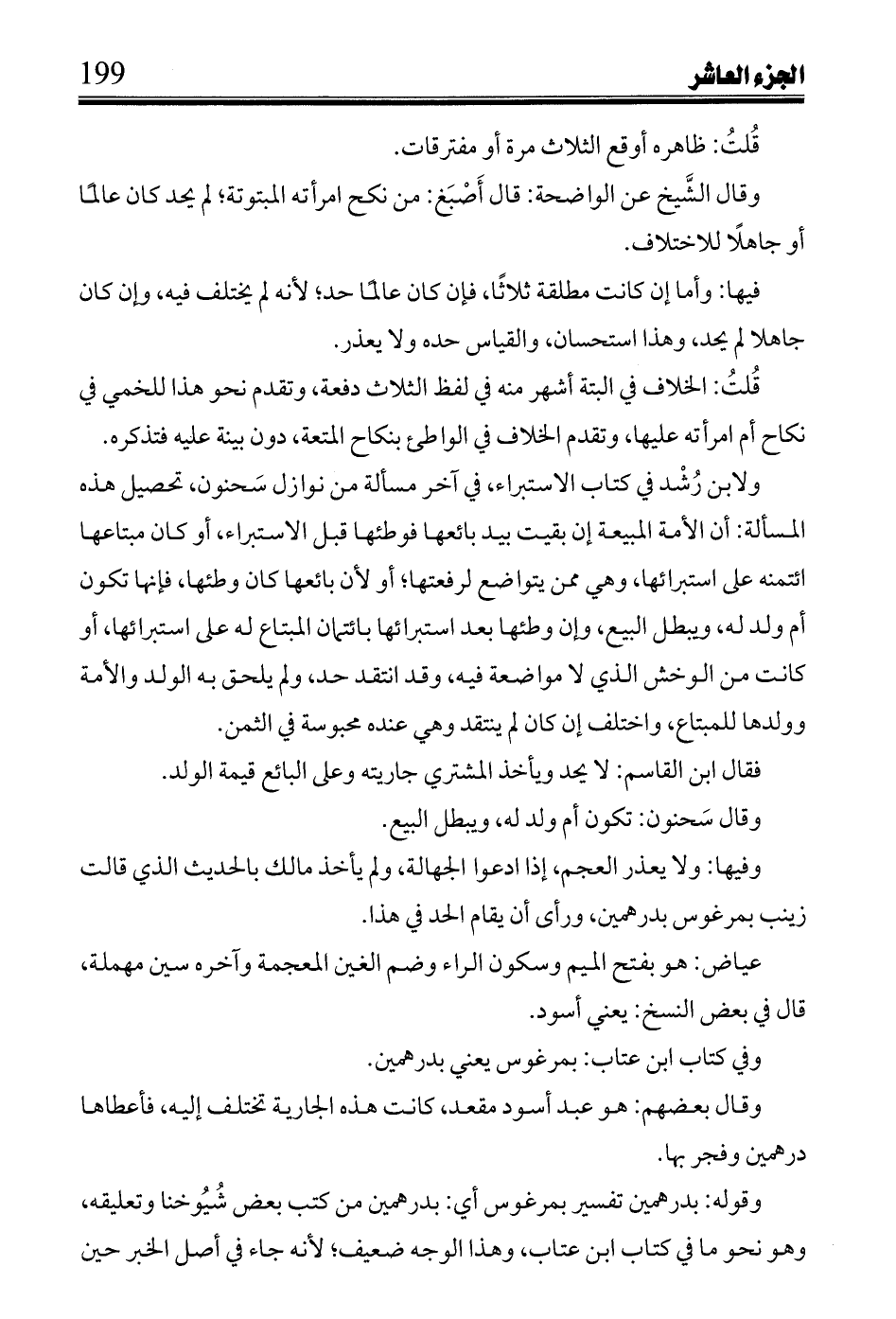 وقال الشيخ عن الواضحة: قال أصبغ: من نكح امرأته المبتوتة؛ لم يحد كان عالماً أو جاهلاً للاختلاف.
