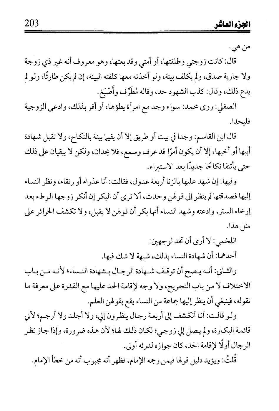 والثاني: أنه يصح أن توقف شهادة الرجال بشهادة النساء؛ لأنه من باب الاختلاف لا من باب التجريح، ولا وجه لإقامة الحد عليها مع القدرة على معرفة ما تقوله، فينبغي أن ينظر إليها جماعة من النساء يقع بقولهن العلم.