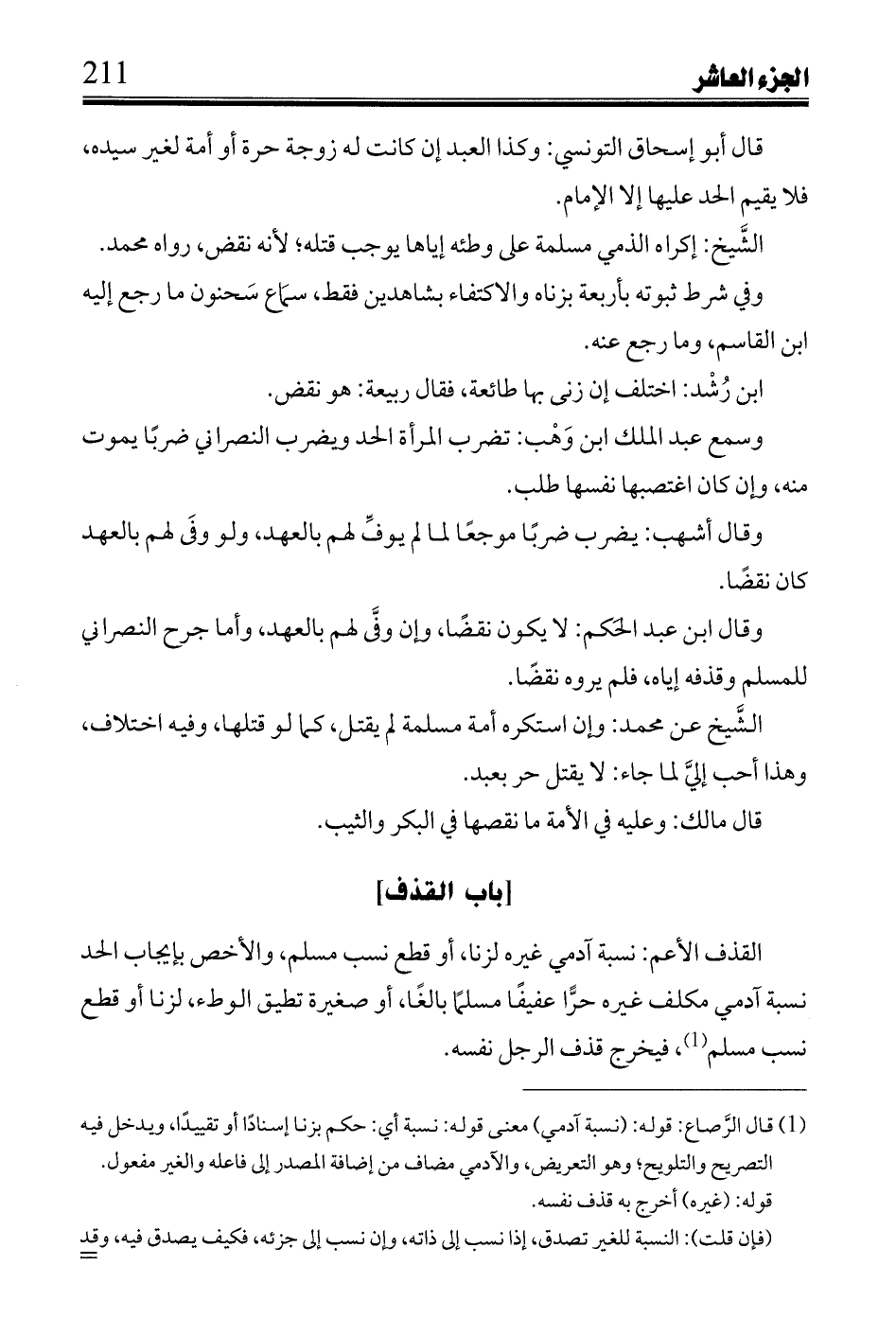 وقال ابن عبد الحَكم: لا يكون نقضًا، وإن وفَّى لهم بالعهد، وأما جرح النصراني للمسلم وقذفه إياه، فلم يروه نقضًا.