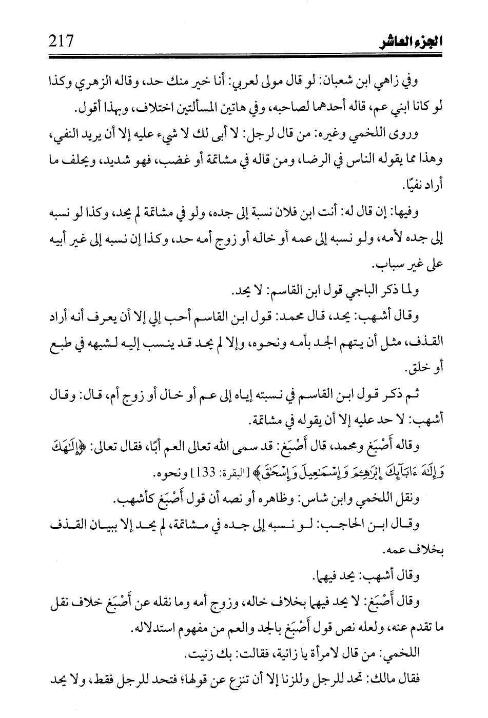 ثم ذكر قول ابن القاسم في نسبته إياه إلى عم أو خال أو زوج أم، قال: وقال أشهب: لا حد عليه إلا أن يقوله في مشاتمة.