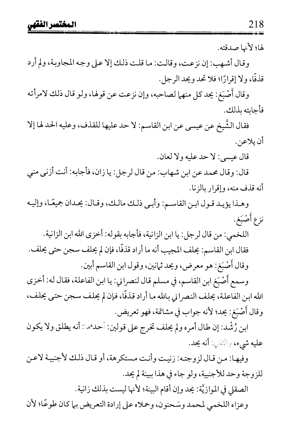 فقال الشَّيخ عن عيسى عن ابن القاسم: لا حد عليها للقذف، وعليه الحد لها إلا أن يلاعن.