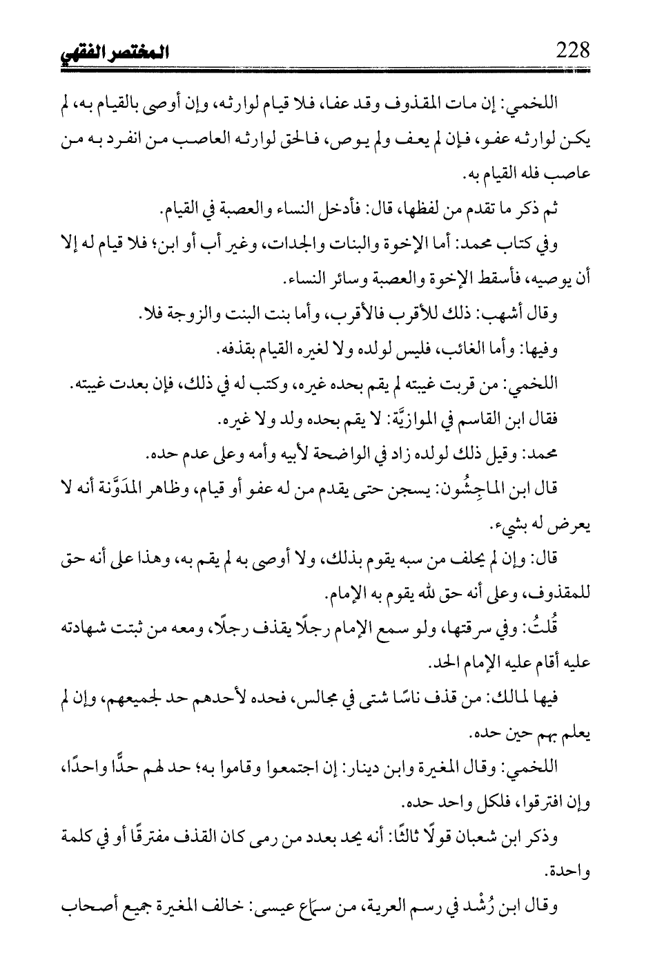اللخمي: إن مات المقذوف وقد عفا، فلا قيام لوارثه، وإن أوصى بالقيام به، لم يكن لوارثه عفو، فإن لم يعف ولم يوص، فالحق لوارثه العاصب من أنفرد به من عاصب فله القيام به.