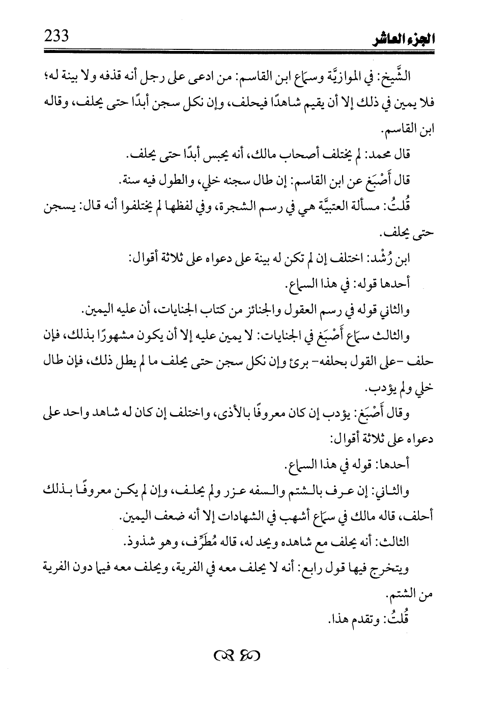 قلت: مسألة العتيبة هي في رسم الشجرة، وفي لفظها لم يختلفوا أنه قال: يسجن حتى يحلف.