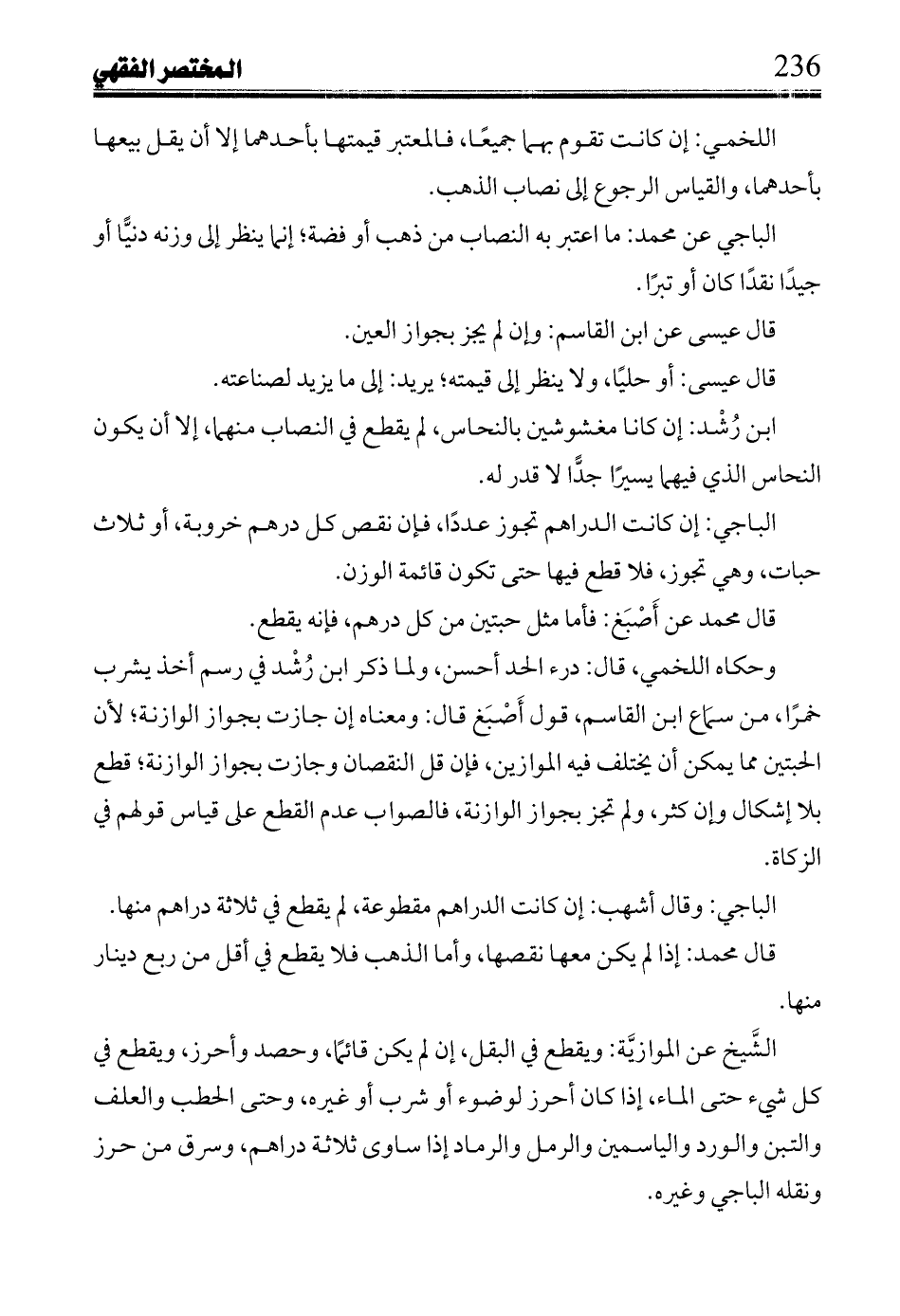 وحكاه اللخمي: قال: درء الحد أحسن، ولم ذكر ابن رشد في رسم أخذ يشرب خمراً، من سماع ابن القاسم، قول أصبغ قال: ومعناه إن جازت بجواز الوازنة؛ لأن الحبتين مما يمكن أن يختلف فيه الموازين، فإن قل النقصان وجازت بجواز الوازنة؛ قطع بلا إشكال وإن كثر، ولم تجز بجواز الوازنة، فالصواب عدم القطع على قياس قولهم في الزكاة.