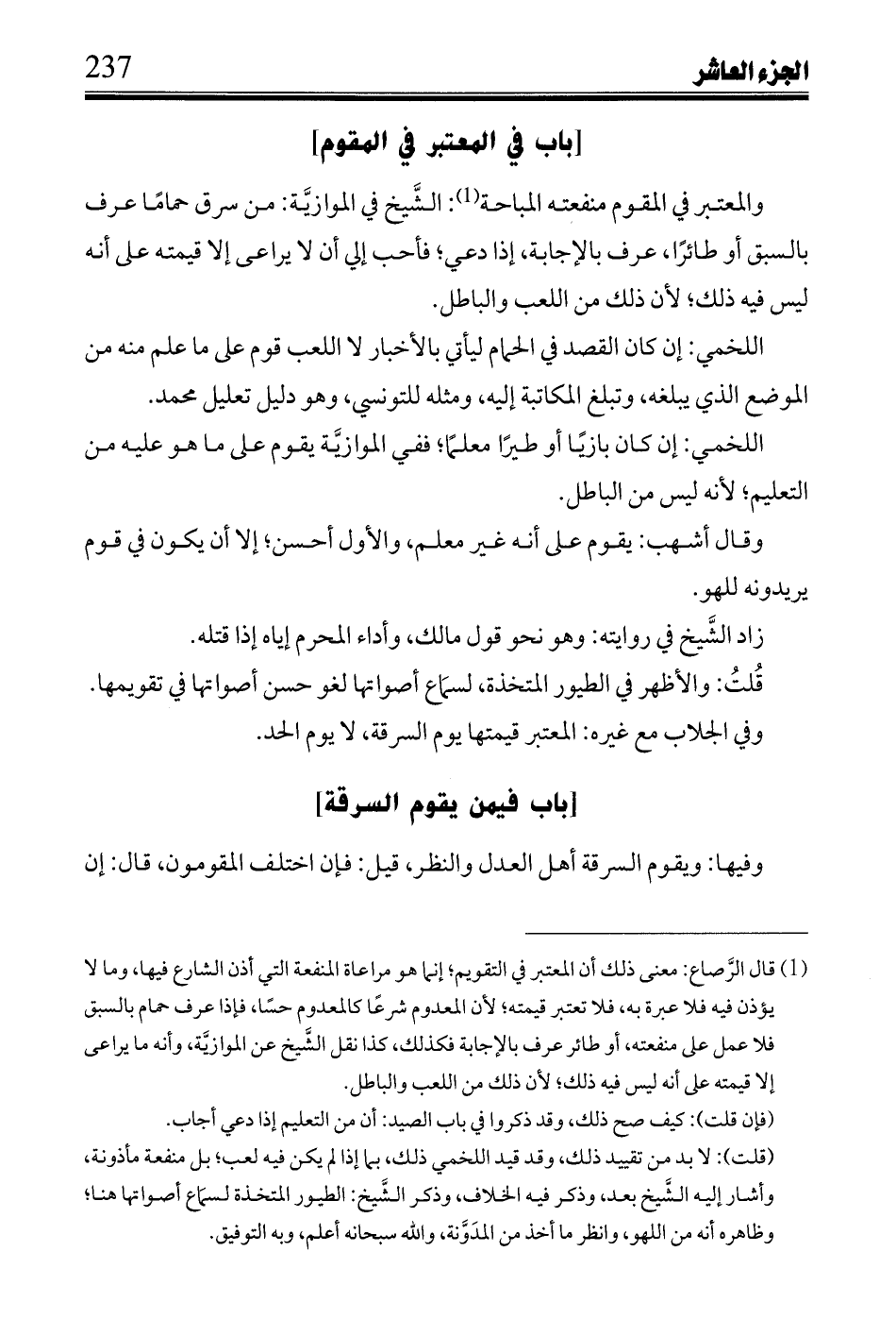 والمعتبر في المقوم منفعته المباحة: الشيخ في الموازية: من سرق حماماً عرف بالسبق أو طائراً، عرف بالإجابة، إذا دعي، فأحب إلى أن لا يراعي إلا قيمته على أنه ليس فيه ذلك، لأن ذلك من اللعب والباطل.