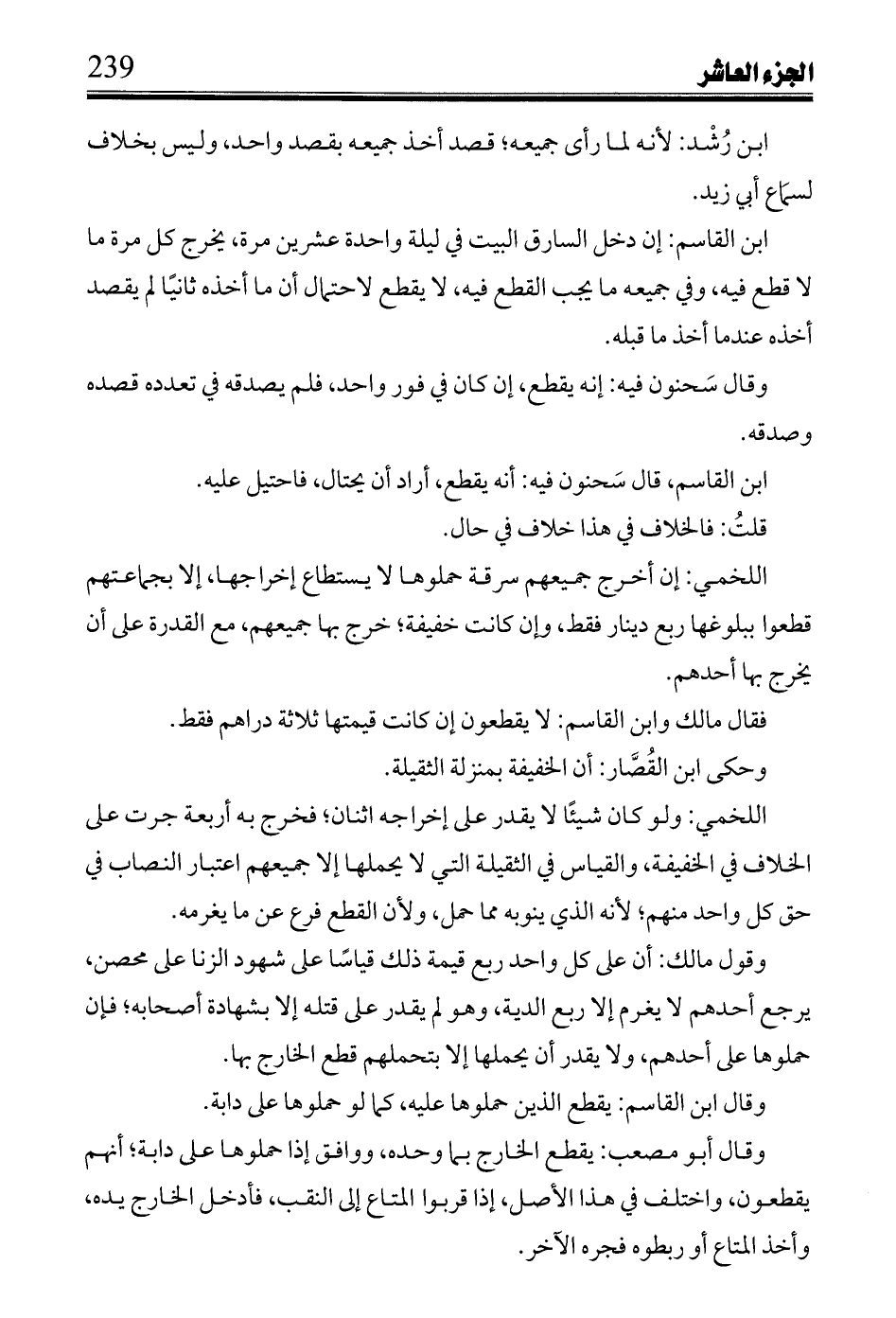 ابن القاسم: إن دخل السارق البيت في ليلة واحدة عشرين مرة، يخرج كل مرة ما لا قطع فيه، وفي جميعه ما يجب القطع فيه، لا يقطع لاحتمال أن ما أخذه ثانياً لم يقصد أخذه عندما أخذ ما قبله.