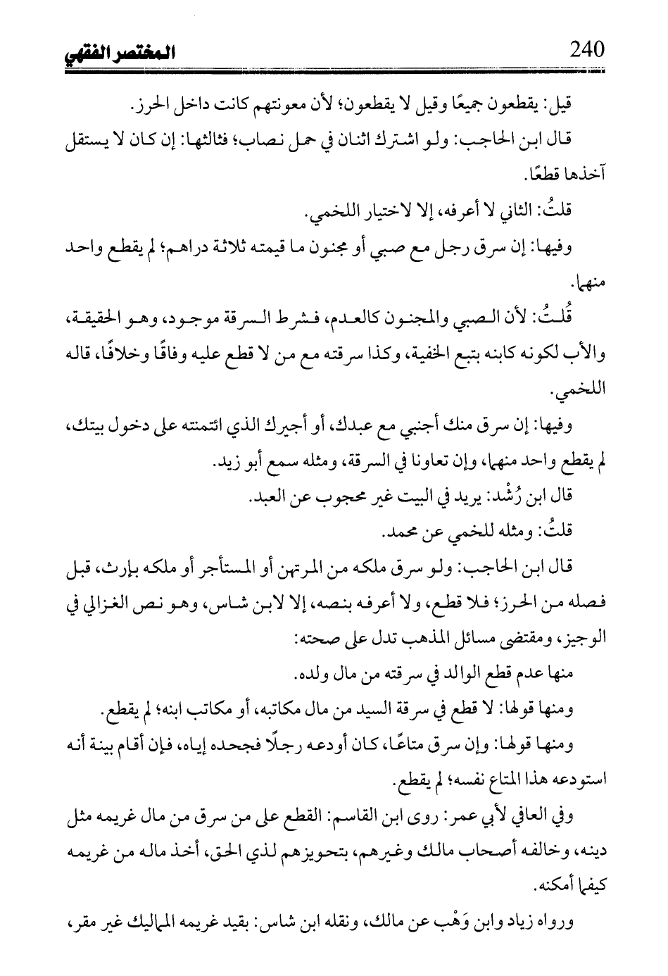 قلت: لأن الصبي والمجنون كالعدم، فشرط السرقة موجود، وهو الحقيقة، والأب لكونه كابنه بتبع الخفية، وكذا سرقته مع من لا قطع عليه وفاقاً وخلافاً، قاله اللخمي.