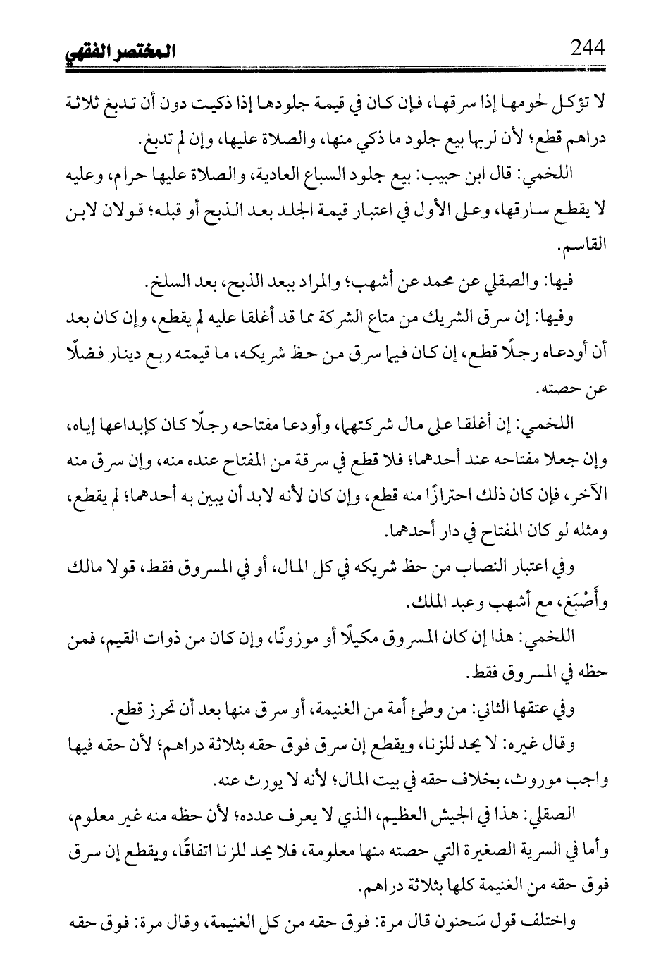 وفي اعتبار النصاب من حظ شريكه في كل المال، أو في المسروق فقط، قولاً مالك وأصبغ، مع أشهب وعبد الملك.